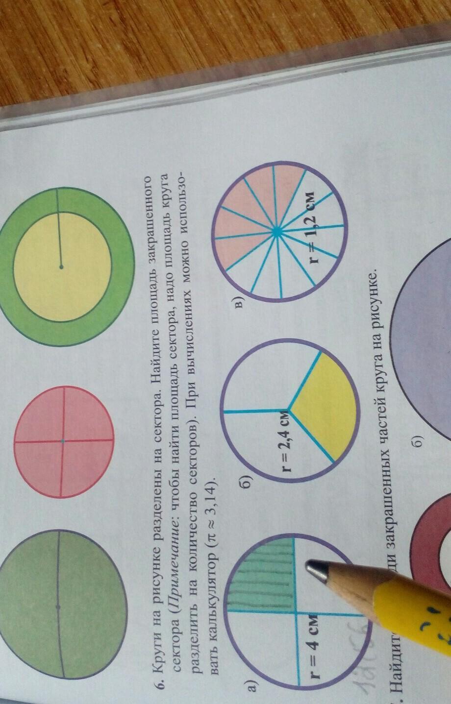 2) S=3,14*2,4²≈18,0864см²(площадь всего круга), т.к. закрашена третья часть, разделим на 3, получим 5,76π(или ≈6,0288см²)