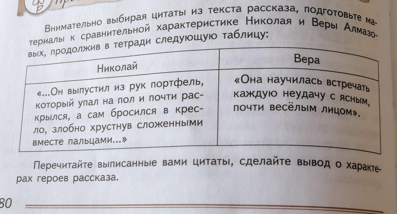 Вывод из всех цитат: Вера и Николай дополняют друг друга. Муж - трудолюбив, настойчив, но теряется при неудаче. Его Вера берет тут же инициативу в свои руки. Его нерешительность дополняется ее уверенностью. Его занудство - ее веселостью. Они любят друг друга и помогают в сложной ситуации. Такой и являются большинство семей! Удачи!
