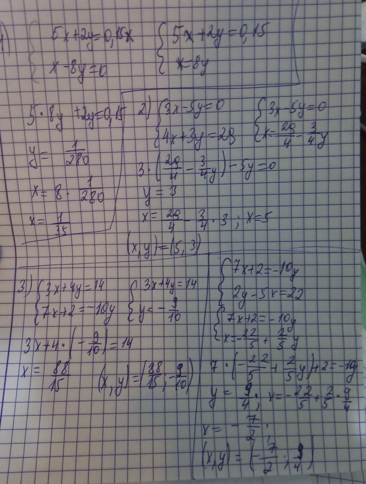 решите системы уравнений: а) 5х+2у=0,15х-8у=0; б) 3х-5у=0, 4х+3у=29; в) 3х+4у=14, -3х+3у=25; г) 7х+2=-10у, 2у-5х=22:
