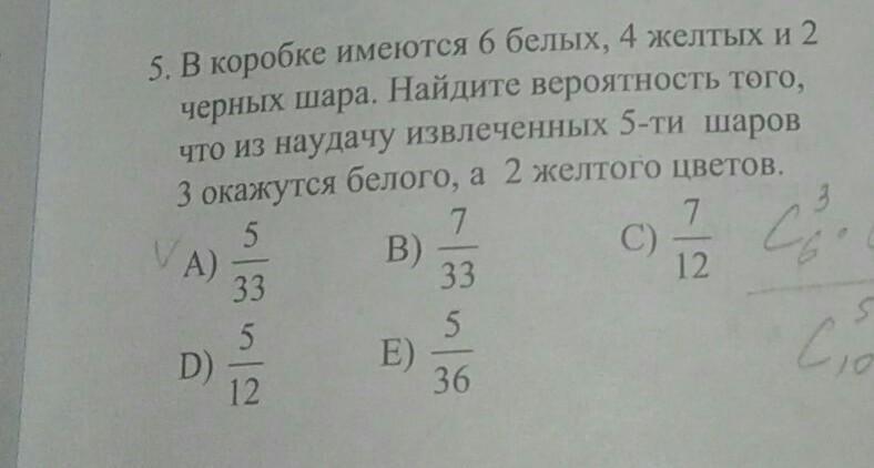 И, наконец, вероятность того, что из наудачу выбранных 5 три окажутся белого, а 2 желтого цвета.