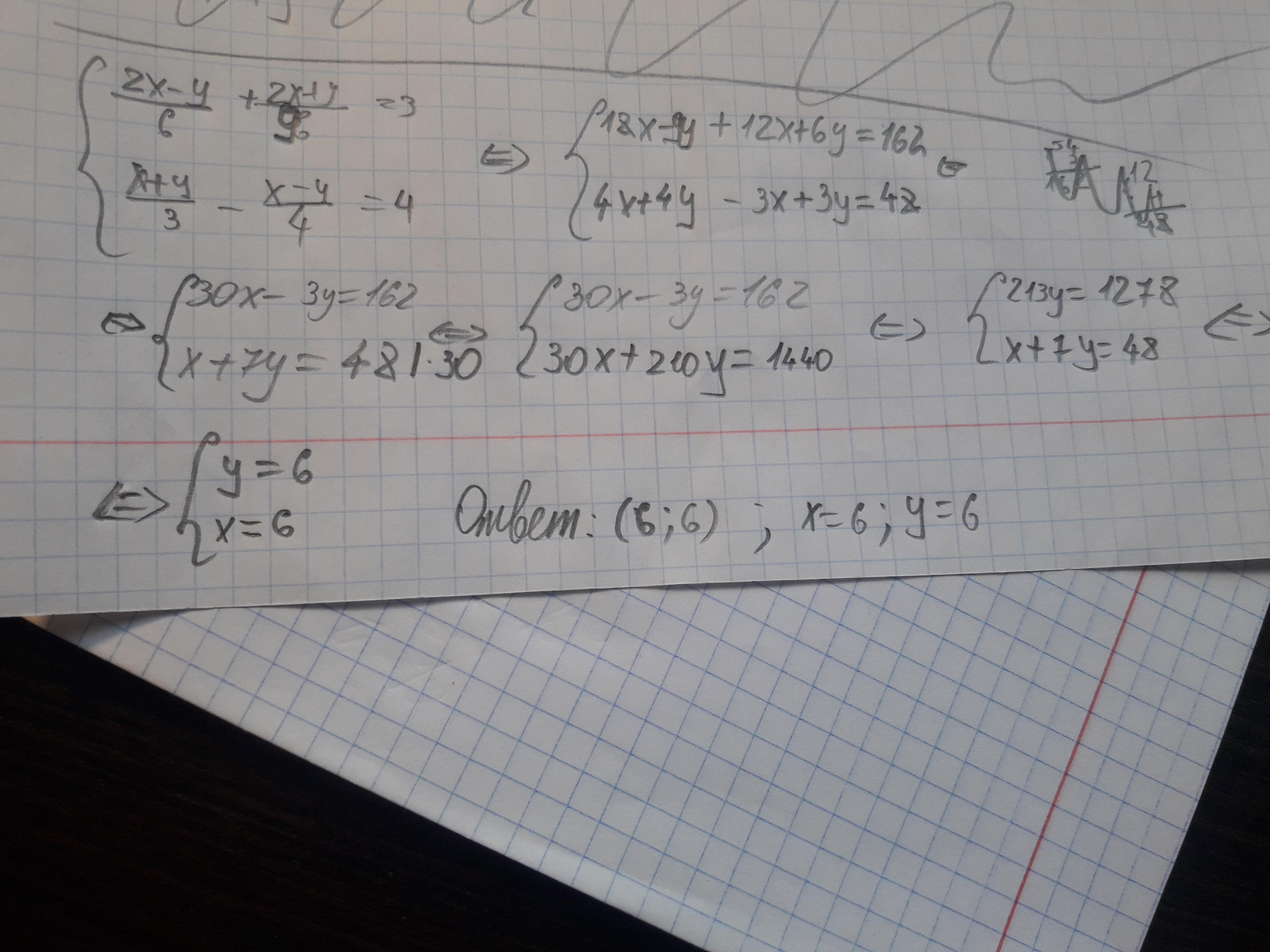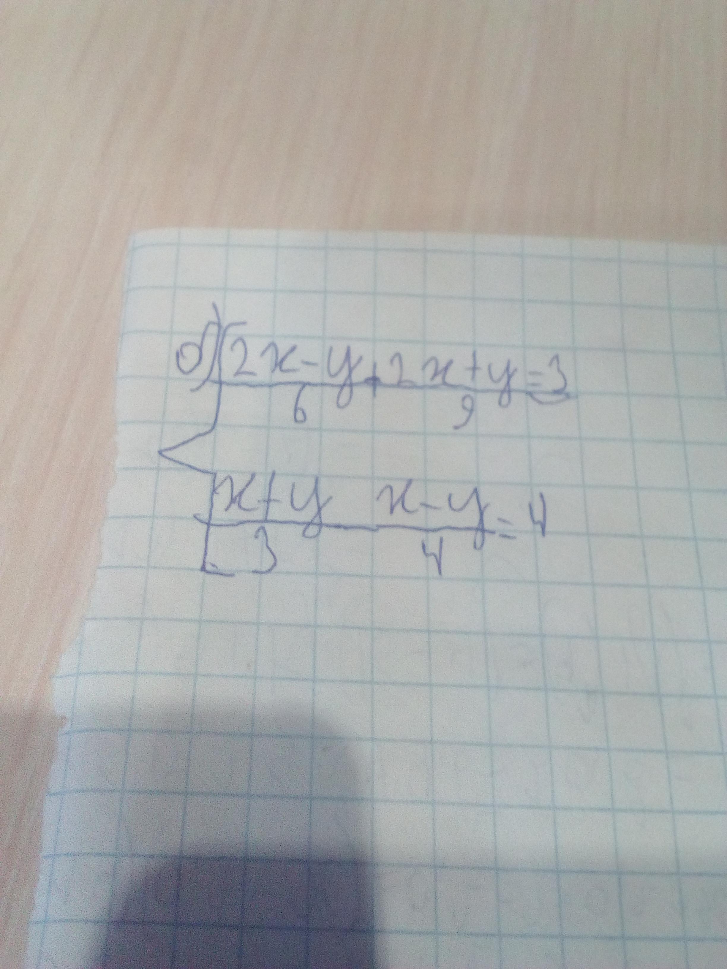 {(2x-y)/6+(2x+y)/9=3 |×18 {3*(2x-y)+2*(2x+y)=54