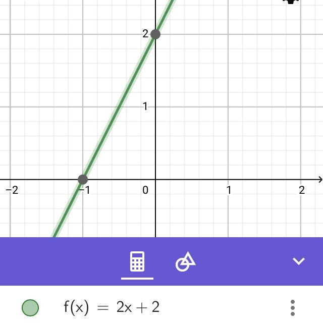 Я надеюсь, что факт, что это прямая, очевиден. Смотри, так как у тебя 2x, то угловой коэффициент равен двум. То есть на 1 деление по x приходится 2 деления по y. Построй график y=2x. Можно даже по 2 точкам. Ну или лучше, если ты поймёшь смысл углового коэффициента. Потом график y=2x сдвинь на 2 деления вверх, так как (+2) там стоит. Получишь такое