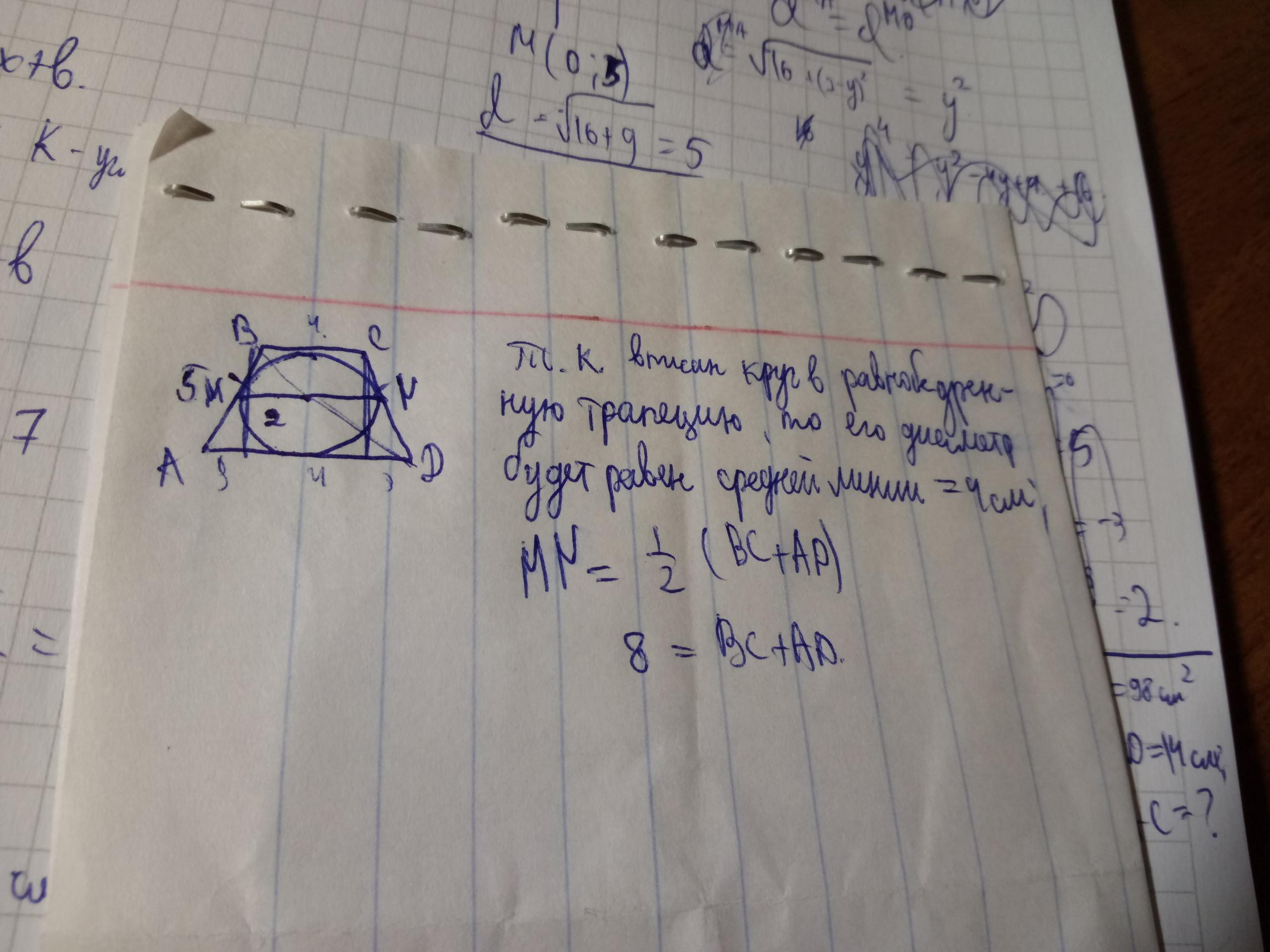 В равнобедренную трапецию с боковой стороной 5 см вписан круг радиуса 2 см. Найти основания трапеции.