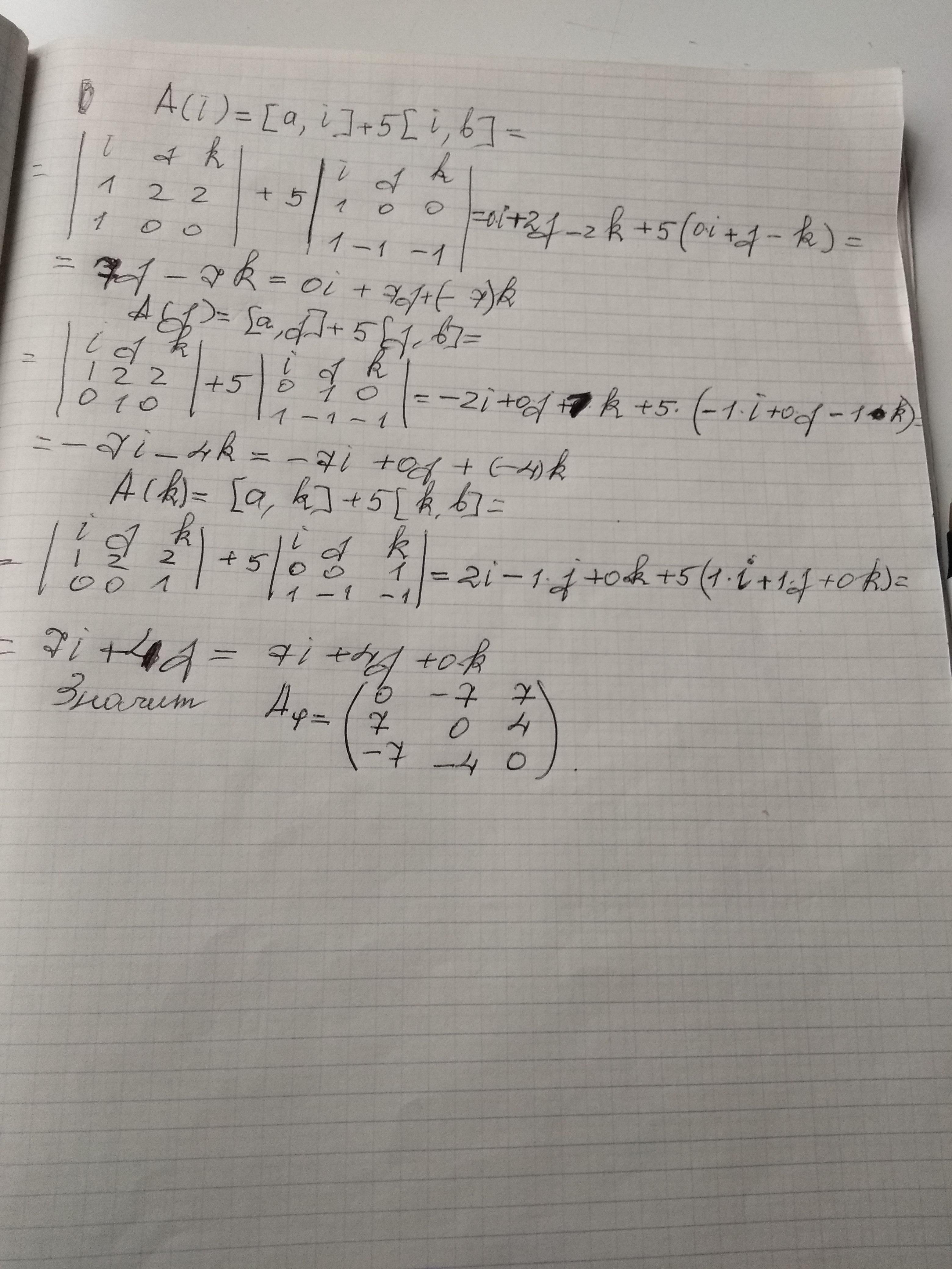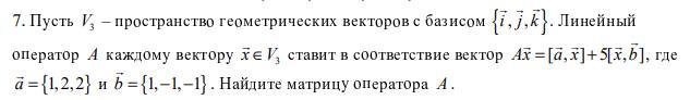 Пусть V₃ - пространство геометрических векторов с базисом { i, j, k}. Линейный оператор A каждому вектору x∈V₃ ставит в соответствие вектор Ax=[a,x]+5[x,b], где a={1,2,2} и b={1,-1,-1}. Найдите матрицу оператора A.