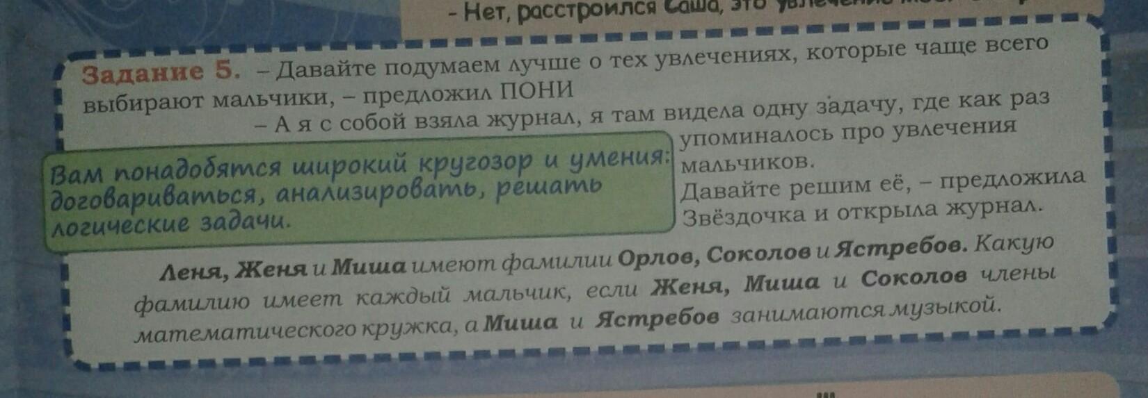 Лёня соколов утверждение из 2 предложения мига не ястребов утверждение из третьего предложения и не соколов так как соколов уже занят значит женя орлов и остаётся мига ястребов
