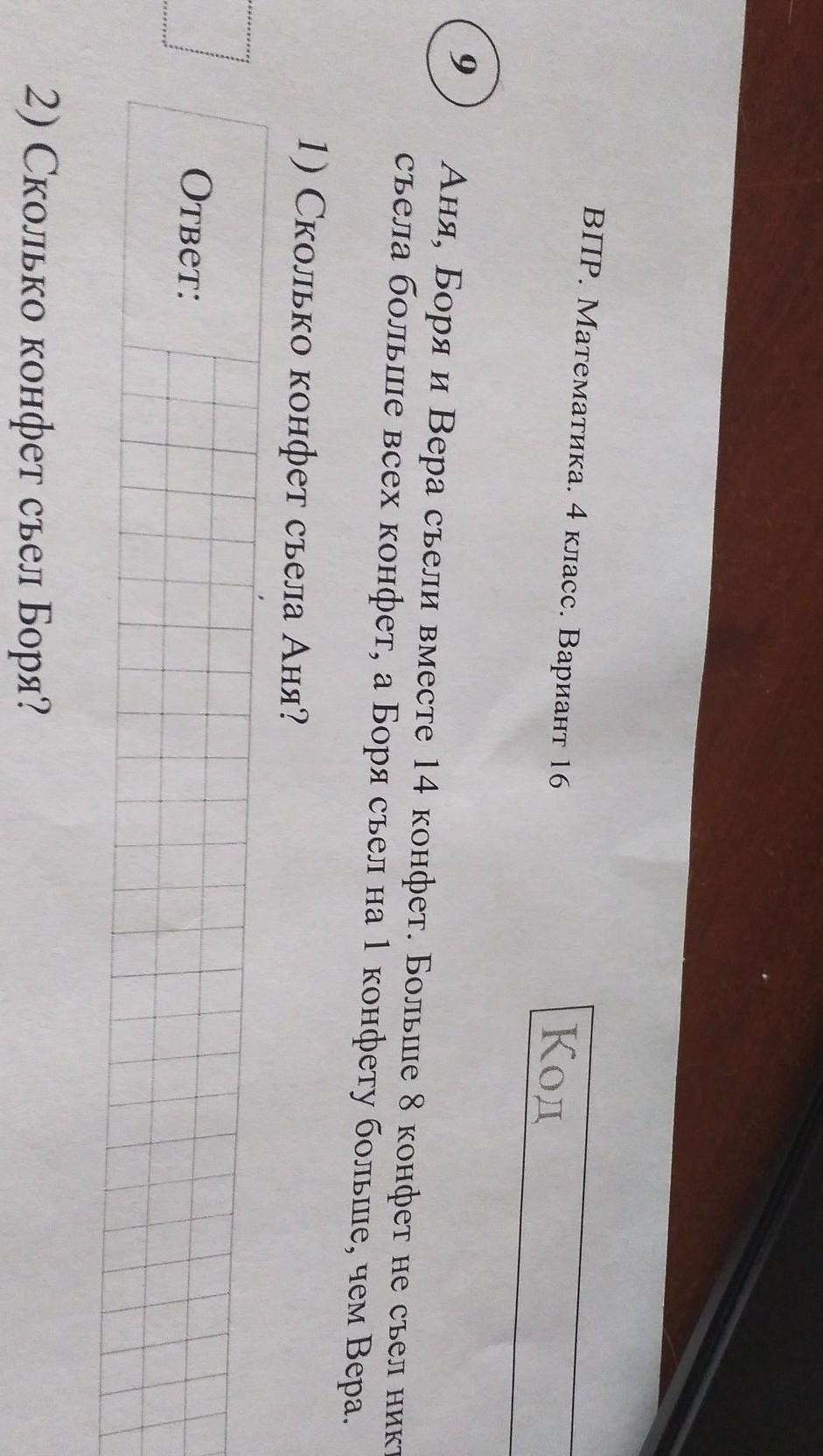 если Боря съел на одну конфету больше чем Вера то значит Боря съел 4 а Вера 3