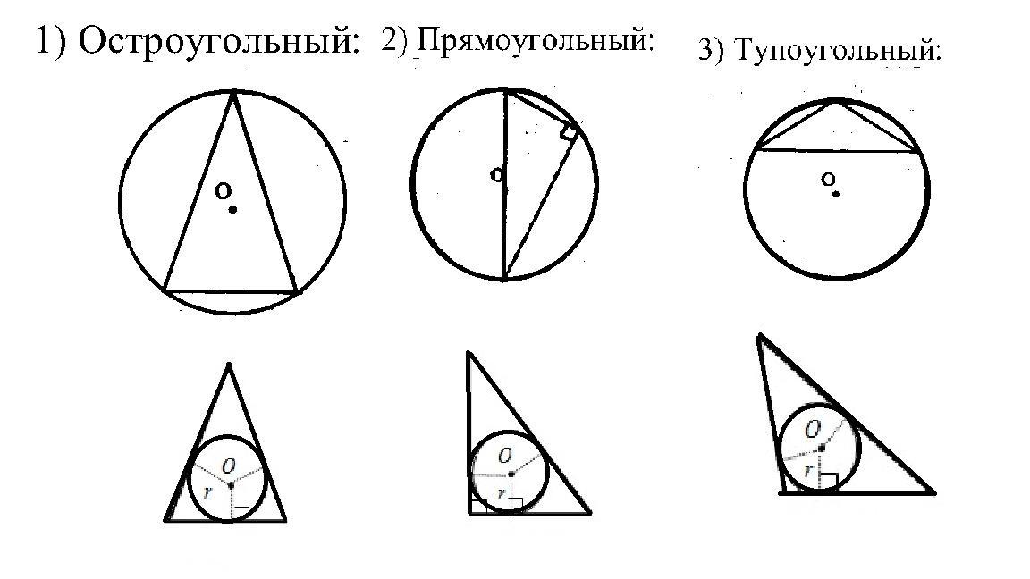 построить по две пары треугольников остроугольный тупоугольный и прямоугольный в каждом из них построить вписанную и описанную окружности