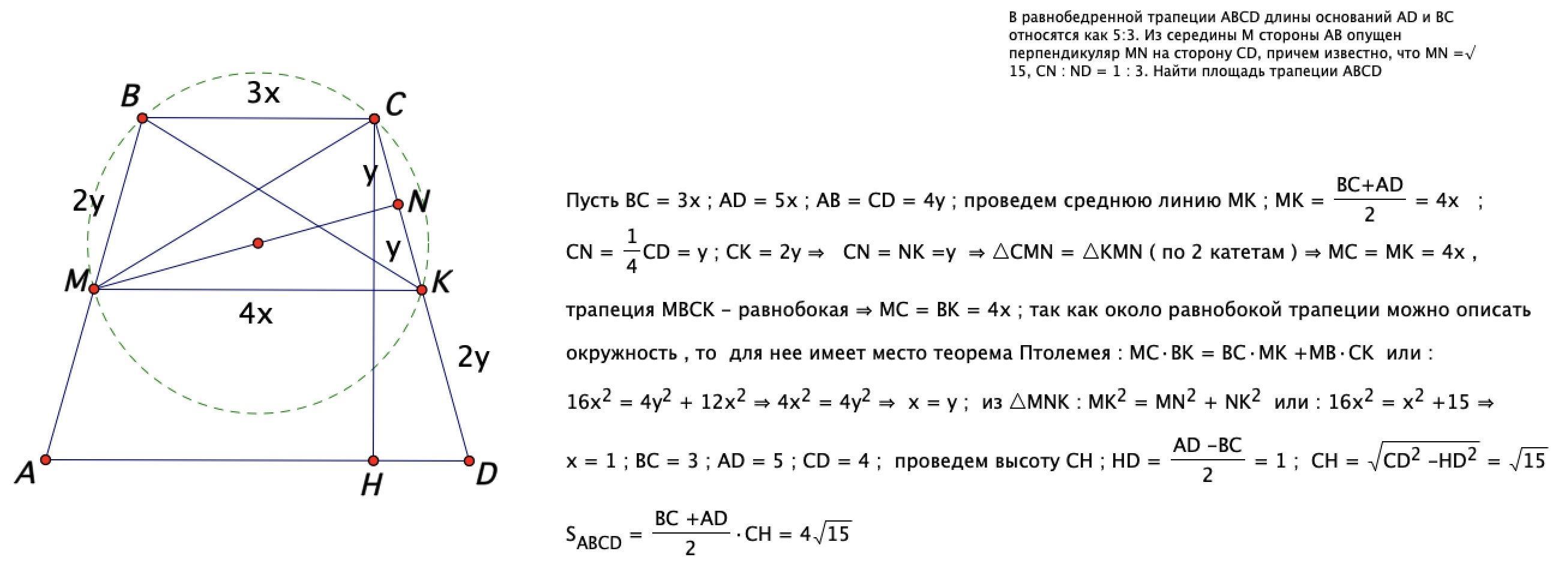 В равнобедренной трапеции ABCD длины оснований AD и BC относятся как 5:3. Из середины М стороны AB опущен перпендикуляр MN на сторону CD, причем известно, что MN =√ 15, CN : ND = 1 : 3. Найти площадь трапеции ABCD