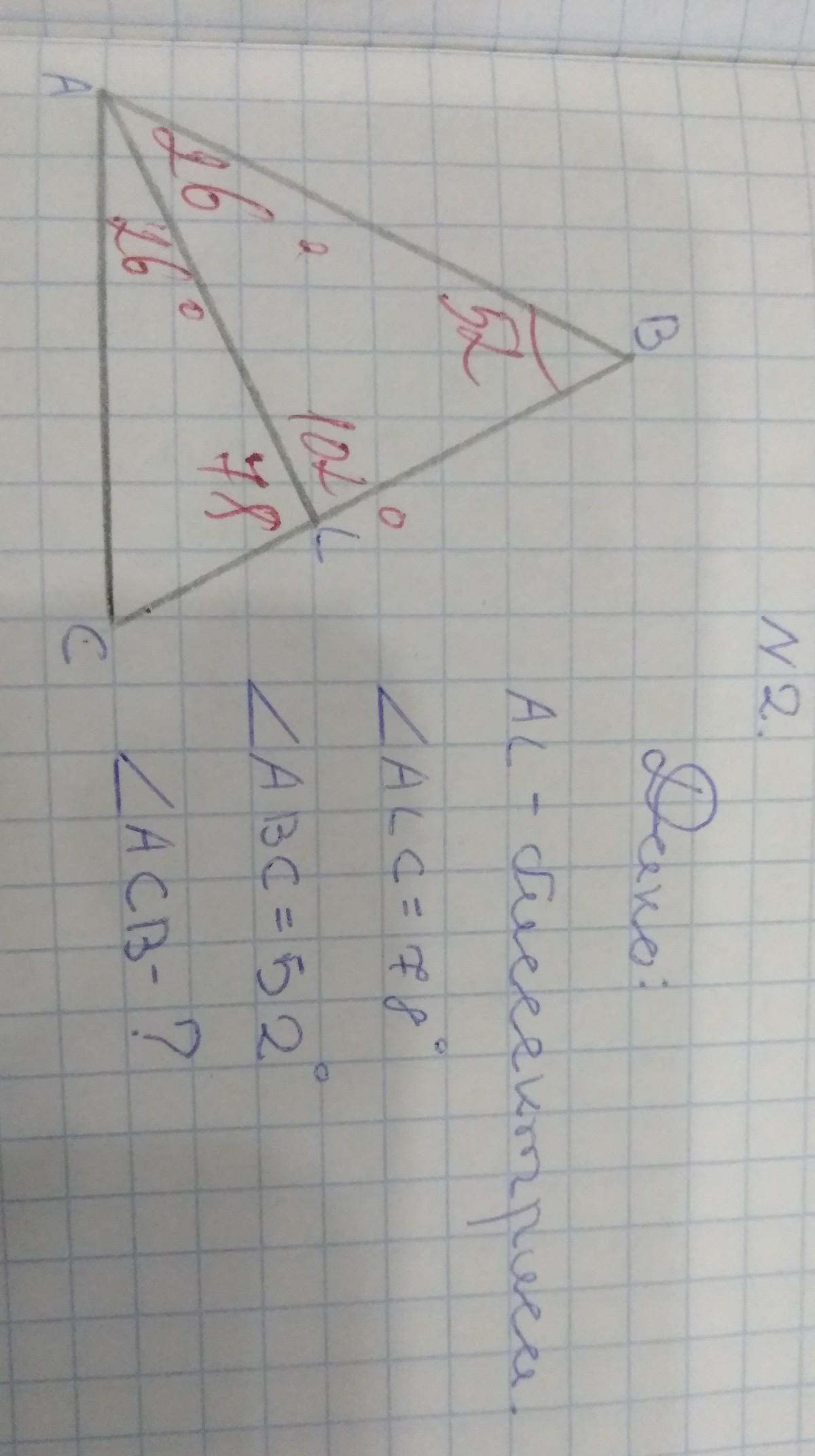 Ответ:очень легко смотри можно решить 2 способами но но самый легкий это взять 180°-(AlC+LAC) получается 180°-(78°+26°)=76