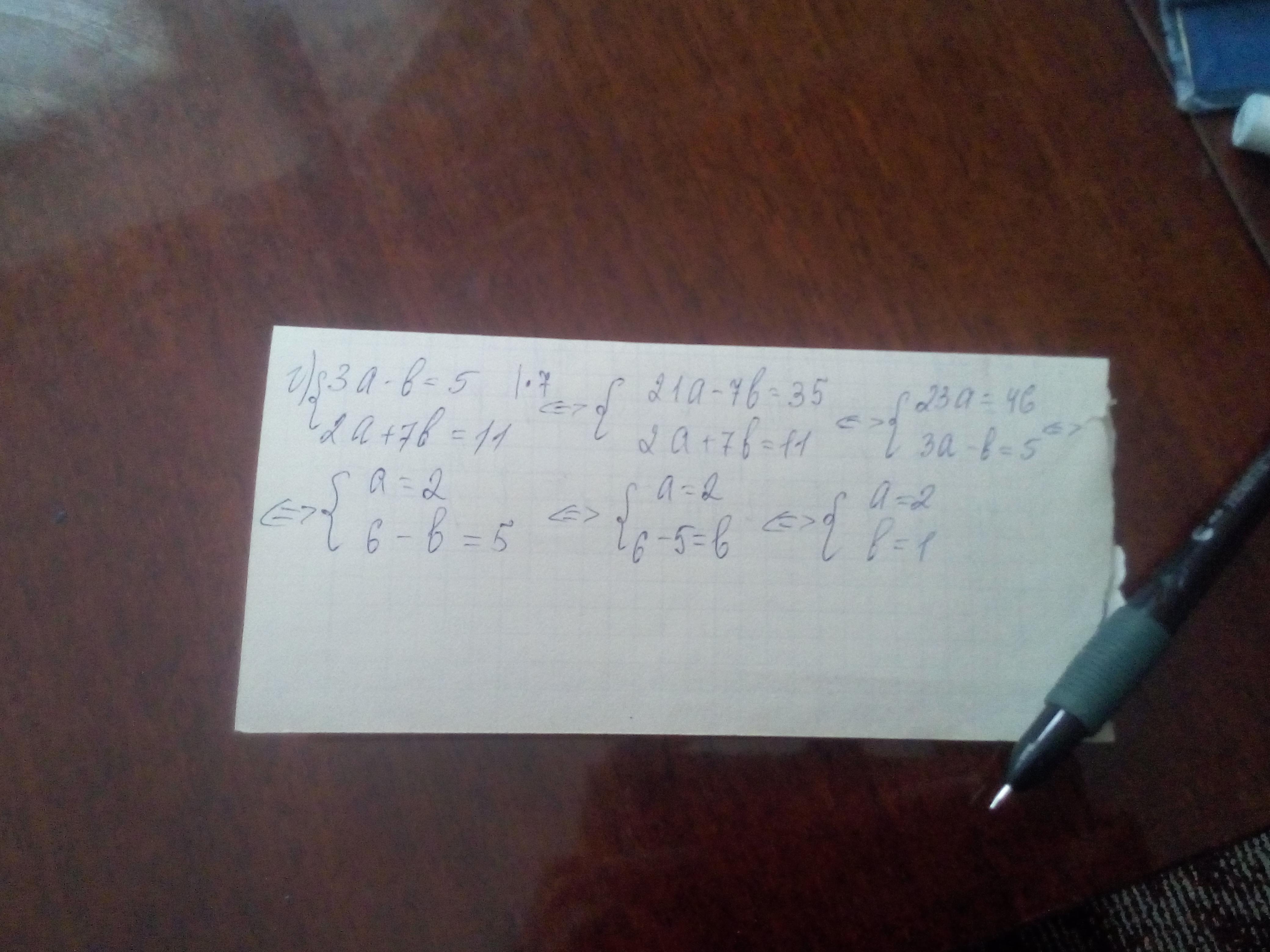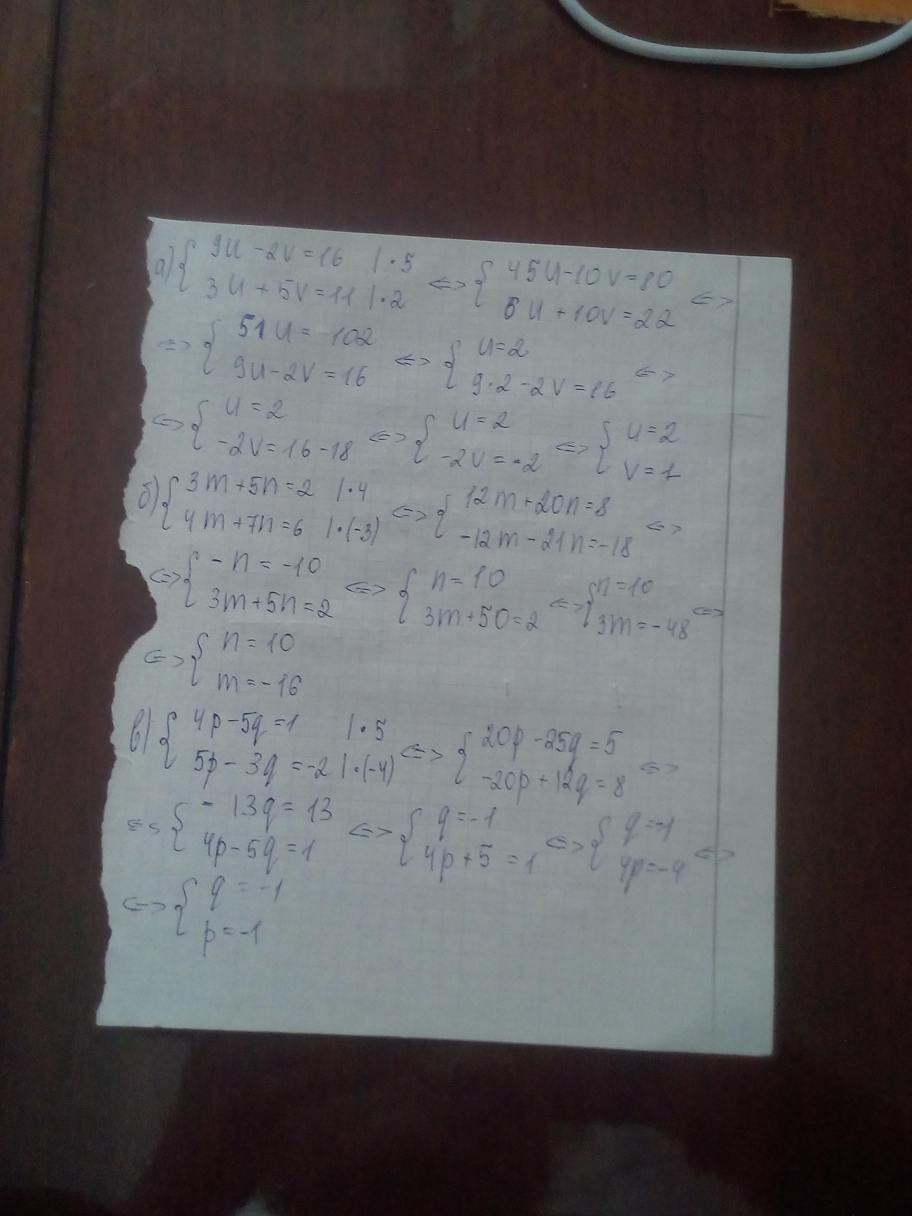 найдите значения переменных данных систем: а) 9u-2v=16, 3u+5v=11; б) 3m+5n=2, 4m+7n=6; в) 4p-5q=1, 5p-3q=-2; г) 3а-b=5, 2a+7b=11: