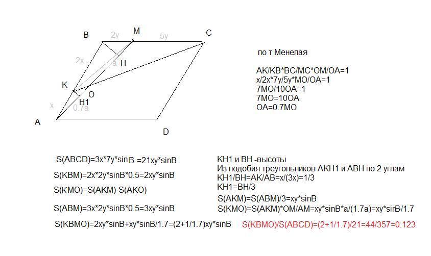 На сторонах AB и BC параллелограмма ABCD выбраны точки K и M так, что AK:KB = 1:2, BM:MC = 2:5. Отрезки AM и CK пересекаются в точке O. Найдите отношение площади четырёхугольника BKOM к площади четырёхугольника ABCD.