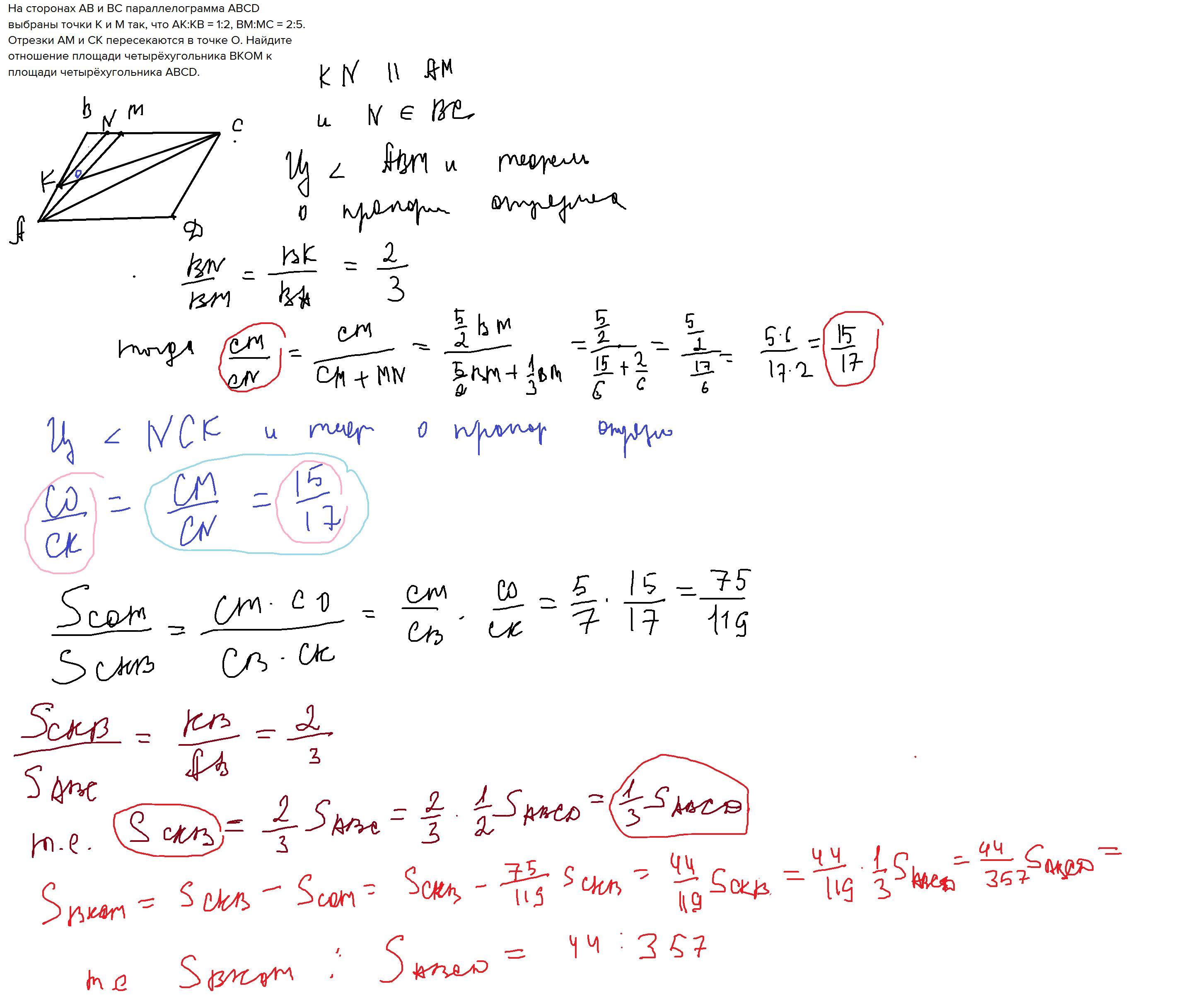 Ответ:На сторонах AB и BC параллелограмма ABCD выбраны точки K и M так, что AK:KB = 1:2