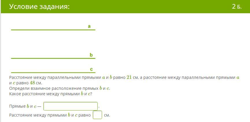 Так как а и с паралельны и а и б паралельны то б ис тоже будут паралельны. Растояние ровно 48 - 21 = 27