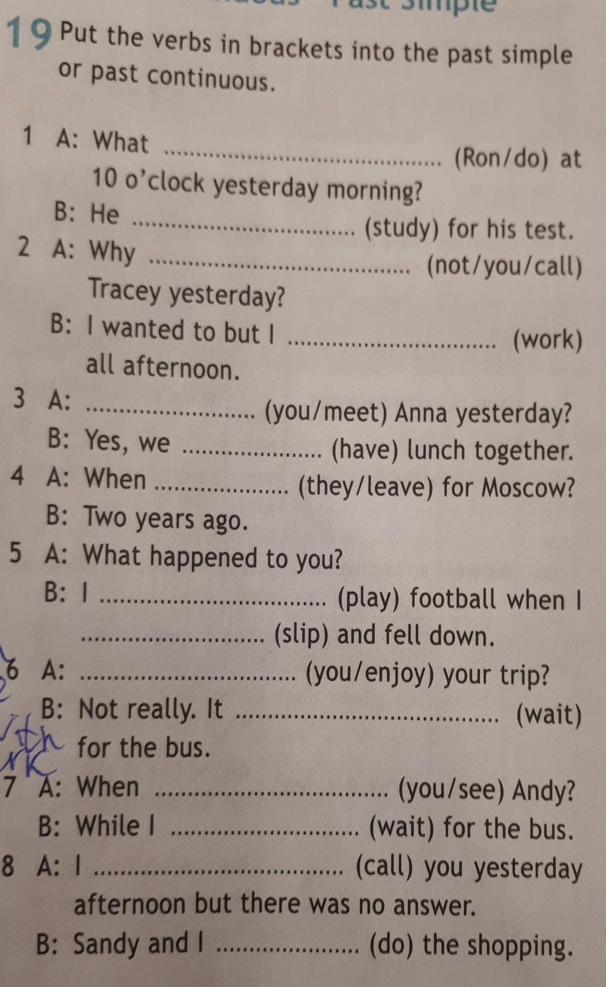 1. was Ron doing; was studying; 2. didn't you call; was working; 3. Did you meet; were having; 4. did they leave; 5. was playing; slipped; 6. Did you enjoy; was waiting; 7. did you see; was waiting; 8. called; were doing