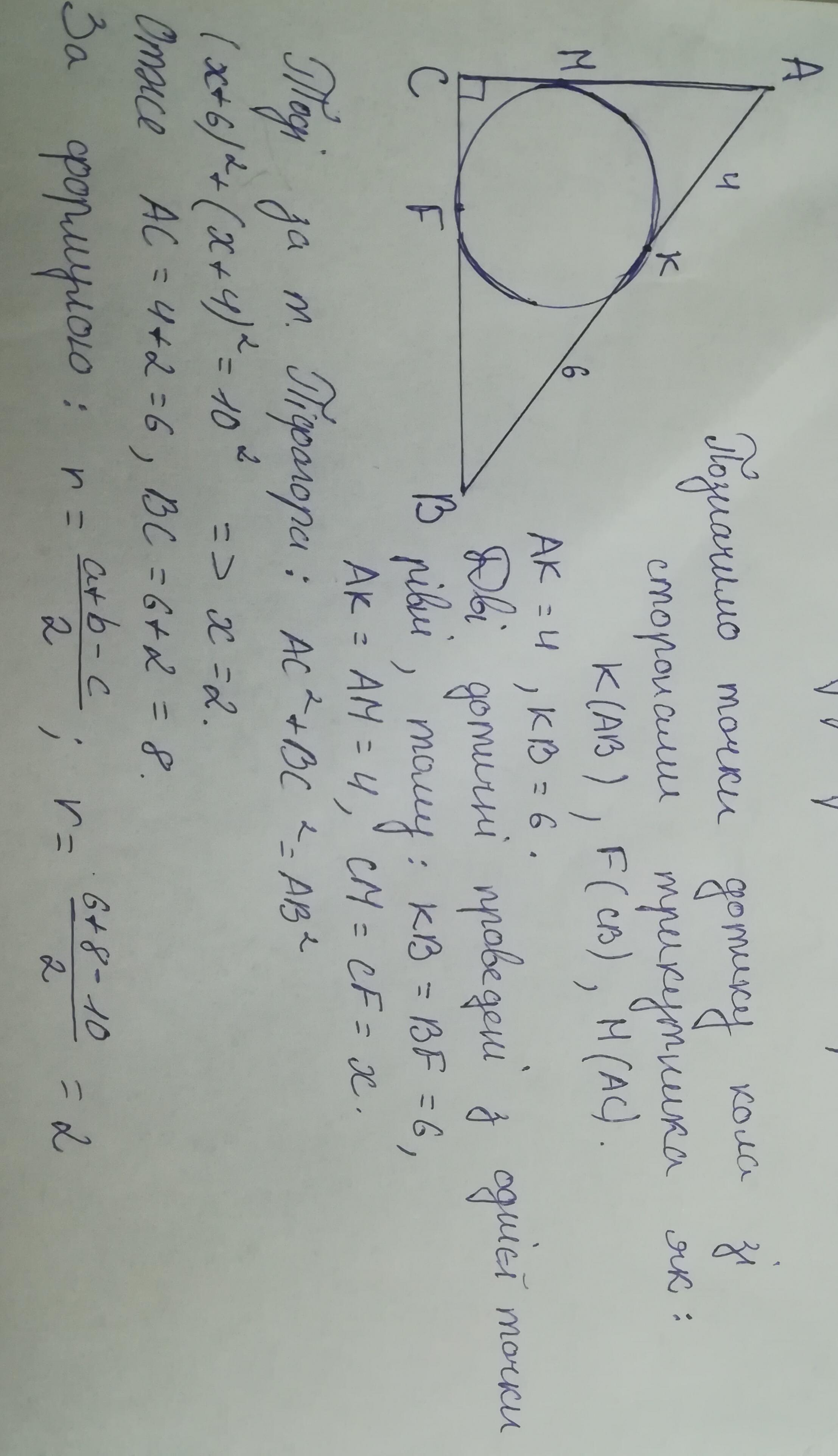 Точка доторку з гіпотенузою AB є точка K(АК=4 см,ВК=6 см).Проводимо від центру кола радіуси до точок доторку з катетом АС-точка М,з катетом СВ-точка N .
