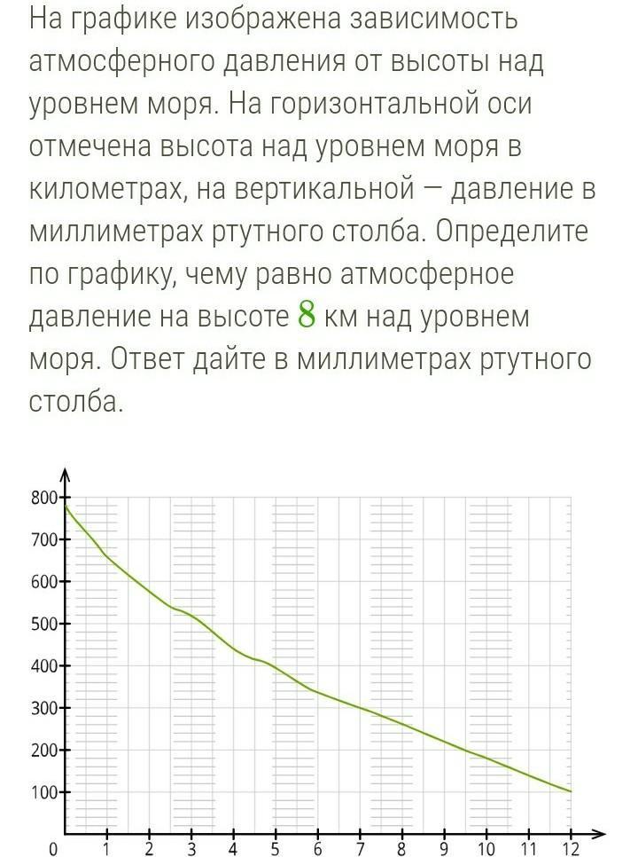 На графике изображена зависимость атмосферного давления от высоты над уровнем моря. На горизонтальной оси отмечена высота над уровнем моря в километрах, на вертикальной — давление в миллиметрах ртутного столба. Определите по графику, чему равно атмосферное давление на высоте 8 км над уровнем моря. Ответ дайте в миллиметрах ртутного столба.