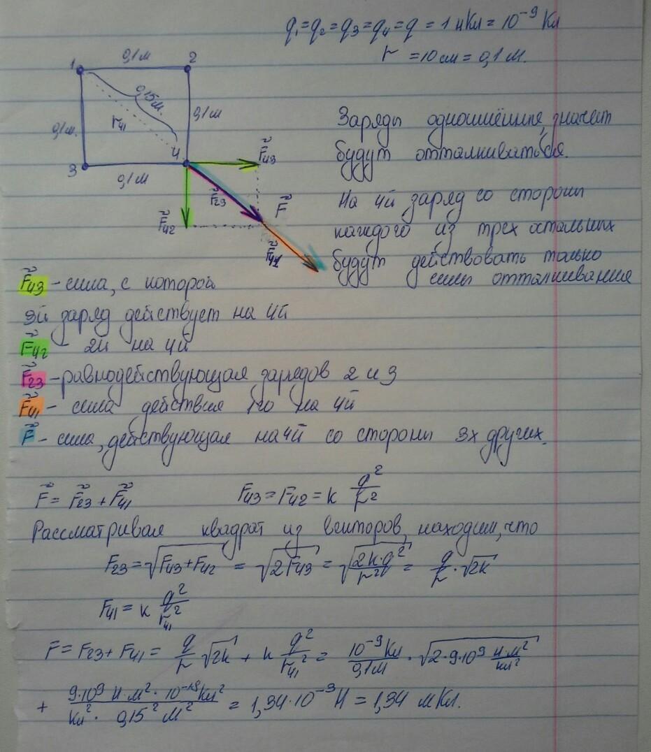 Имеется квадрат со стороной 10см. В вершинах находится 4 заряда по 1 нанокулону. Найти силу, действующую со стороны 3х зарядов на 4ый
