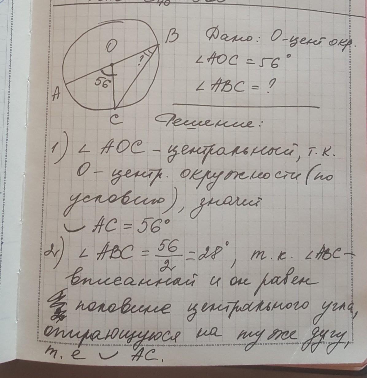 Так как угол AOC и угол ABC на одной дуге круга, это означает что ABC=1/2AOC=1/2 × 56= 28 градусов