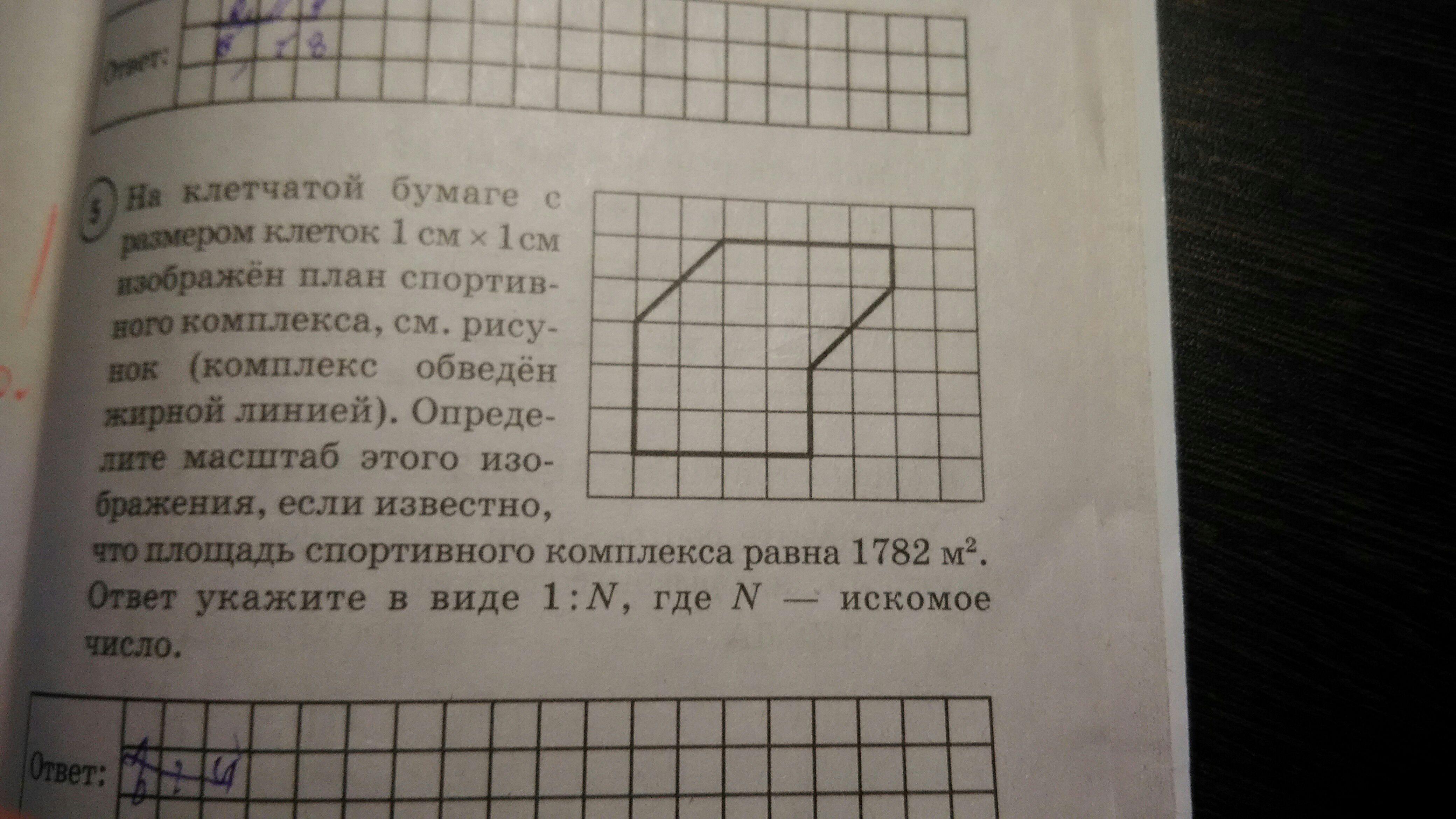 На клетчатой бумаге с размером клеток 1 см х 1см изображён план спортив- ного комплекса, см. рису- нок (комплекс обведён жирной линией). Опреде- лите масштаб этого изо- бражения, если известно, что площадь спортивного комплекса равна 1782 м“. Ответ укажите в виде 1:N, где N — искомое число..
