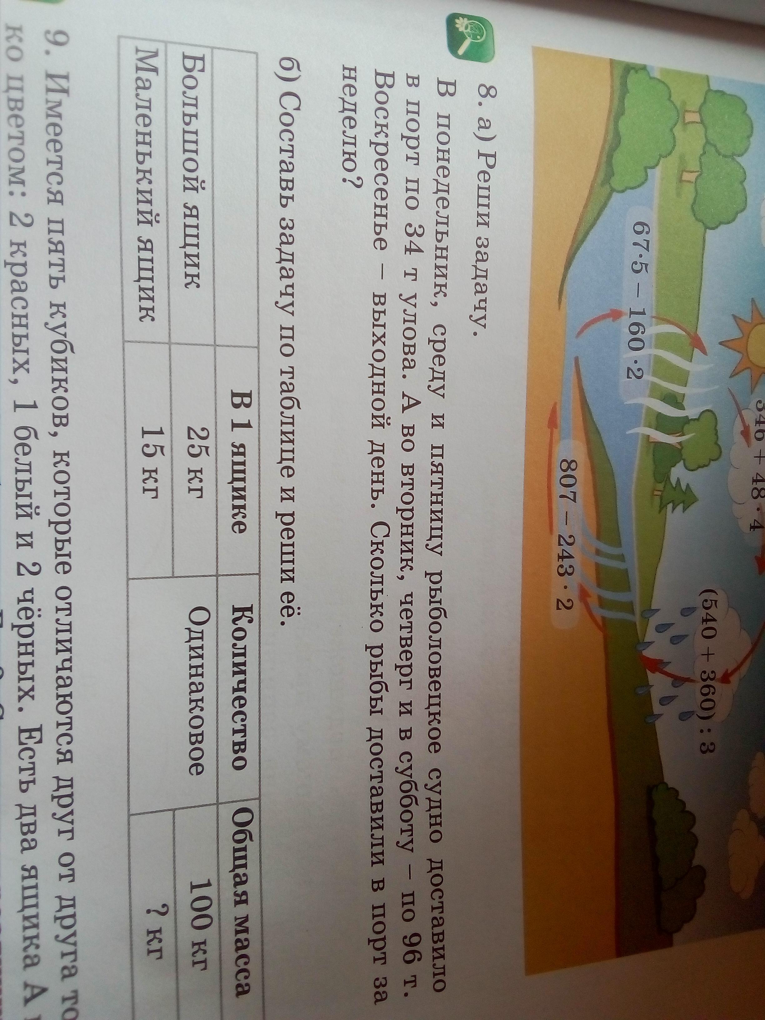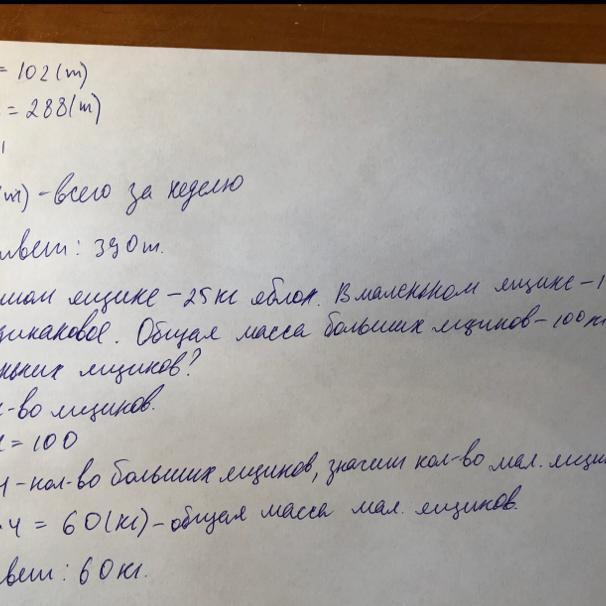 б) В большом ящике–25 кг яблок. В маленьком ящике–15кг. Количество ящиков одинаковое. Общая масса больших ящиков–100кг. Какая общая масса маленьких ящиков? Решение в фото.