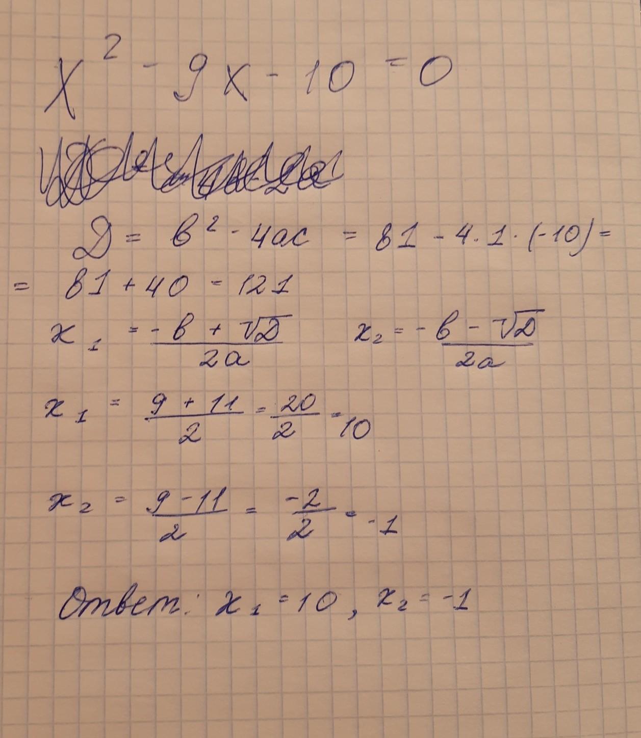 а=1, в=-9, с=-10, D=в^2-4ас=81-4*1*(-10)=81+40=121, х=-в+-VD /2a, х1=9+11 /2=10, х2=9-11 /2=-2/2=-1, корни 10 и -1