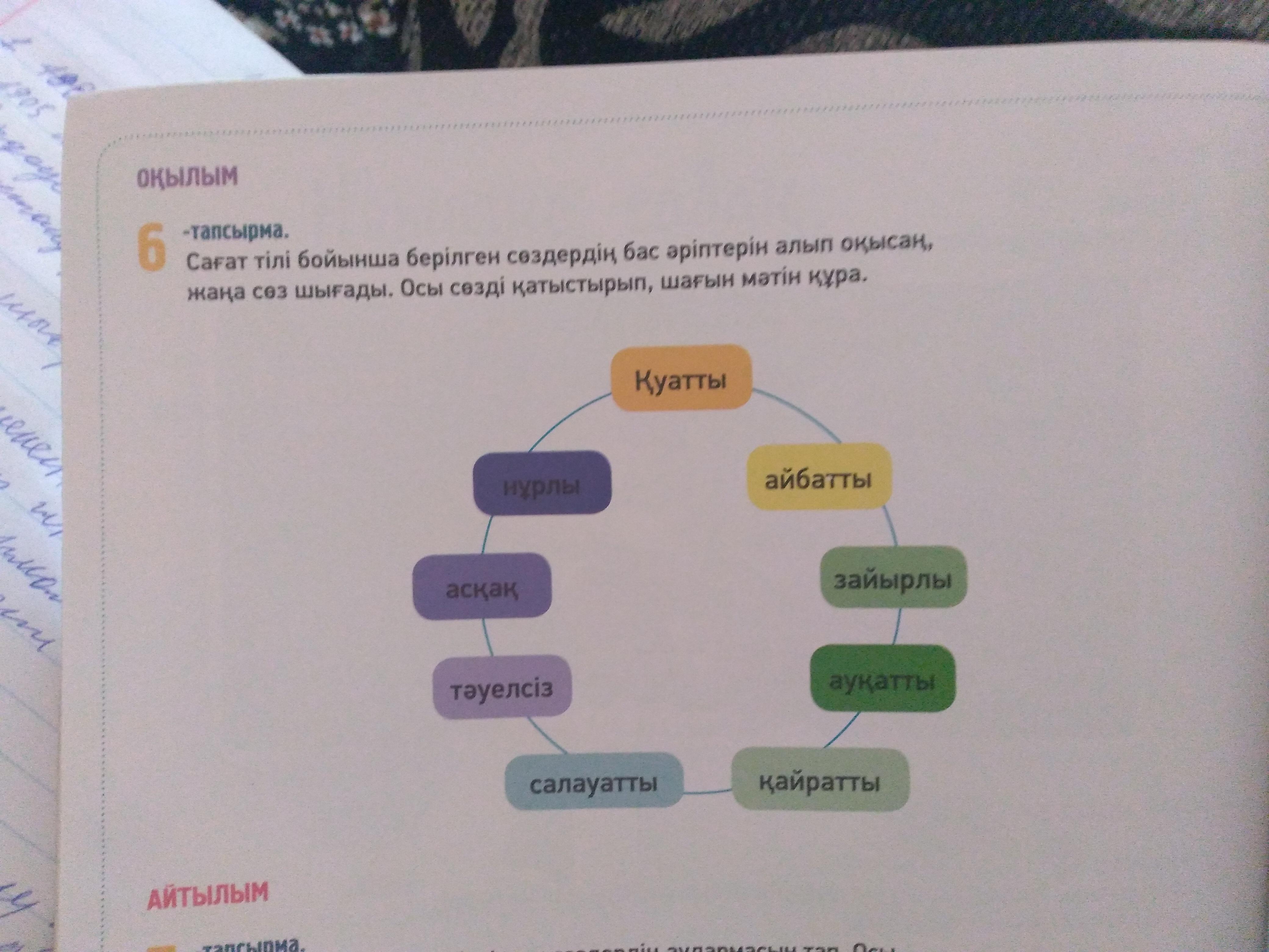 Қазақстан деген сөз шығады.Менің туып, өскен жерім –Егемен ел Қазақстан. Қазақстан тәуелсіз, жері кең, ұлан байтақ, егеменді ел. Қазақстан жерінің асты да, үсті де бай. Асты бай дегенім-көптеген қазба байлықтары, ал, үсті бай дегенім-Қазақстан жеріндегі бейбіт, аспаны ашық, қырандай самған, өмір сүріп жүрген қазақтарым.