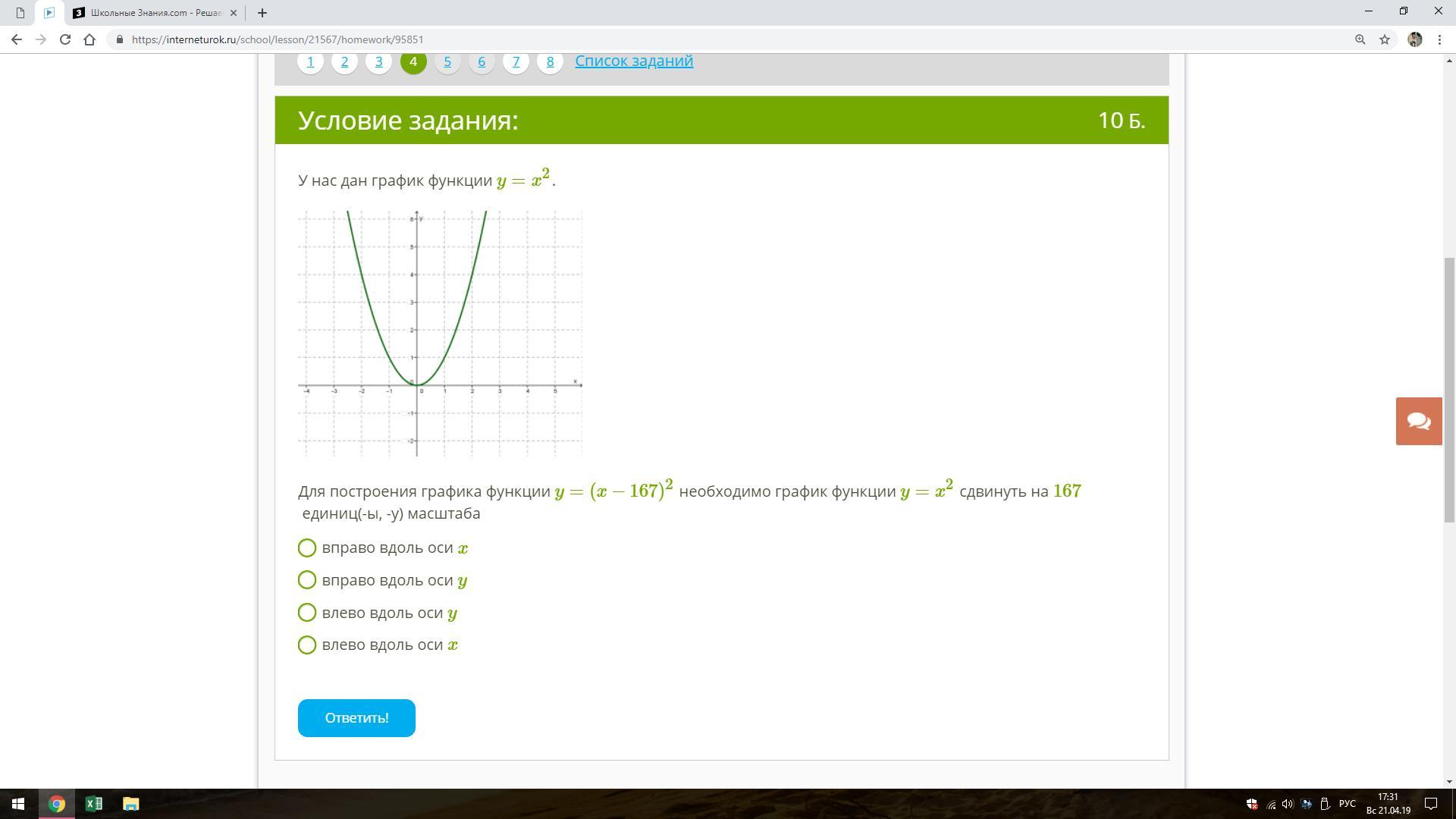 Для построения графика функции y=(x−167)2 необходимо график функции y=x2 сдвинуть на 167 единиц(-ы, -у) масштаба