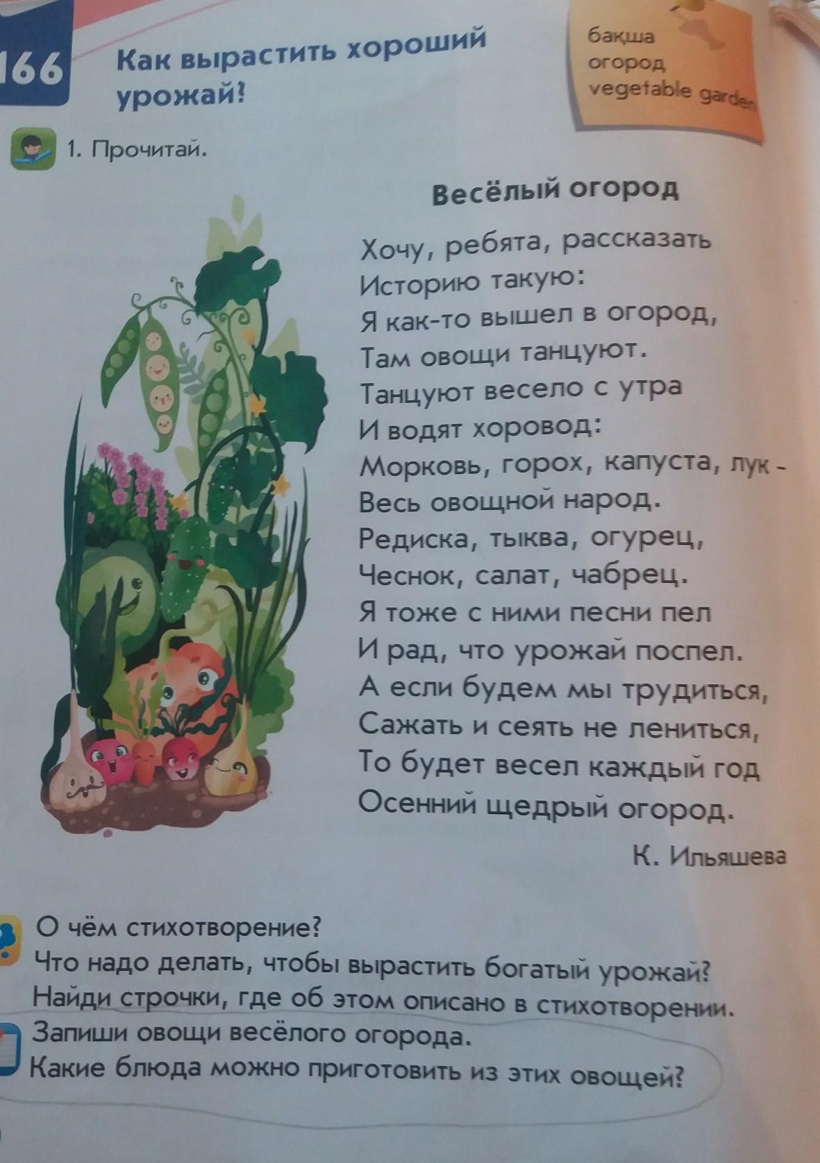 Морковь,горох,капуста,лук,редиска,тыква,огурец,чеснок,салат,чабрец. Из моркови и огурца можно приготовить салат . Из тыквы запеканку или пирог, с чабрецом вкусный чай, а всё остальное тоже пустить на салат.