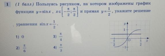 Пользуясь рисунком на котором изображёны график функции y=sinx, х принадлежит [-П/2; П/2] и прямая у= 1/2, укажите решение уравнения sinx=1/2