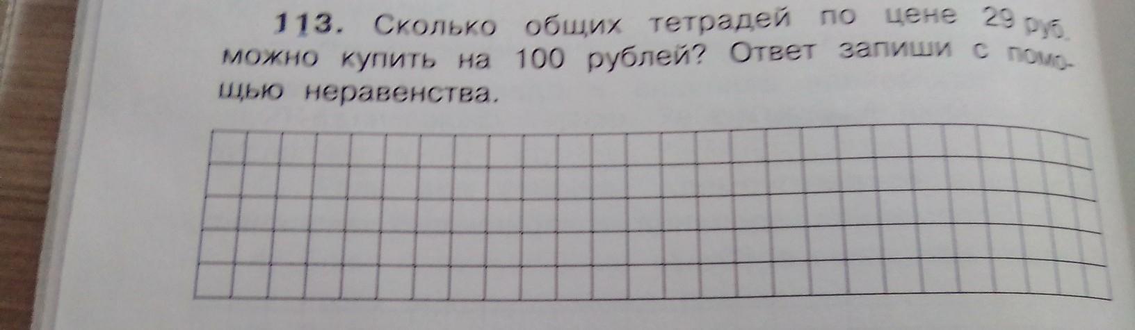Сколько общих тетрадей по цене 29 руб. можно купить на 100 рублей ? Ответ запиши с помощью НЕРАВЕНСТВА . Дам 5 баллов .