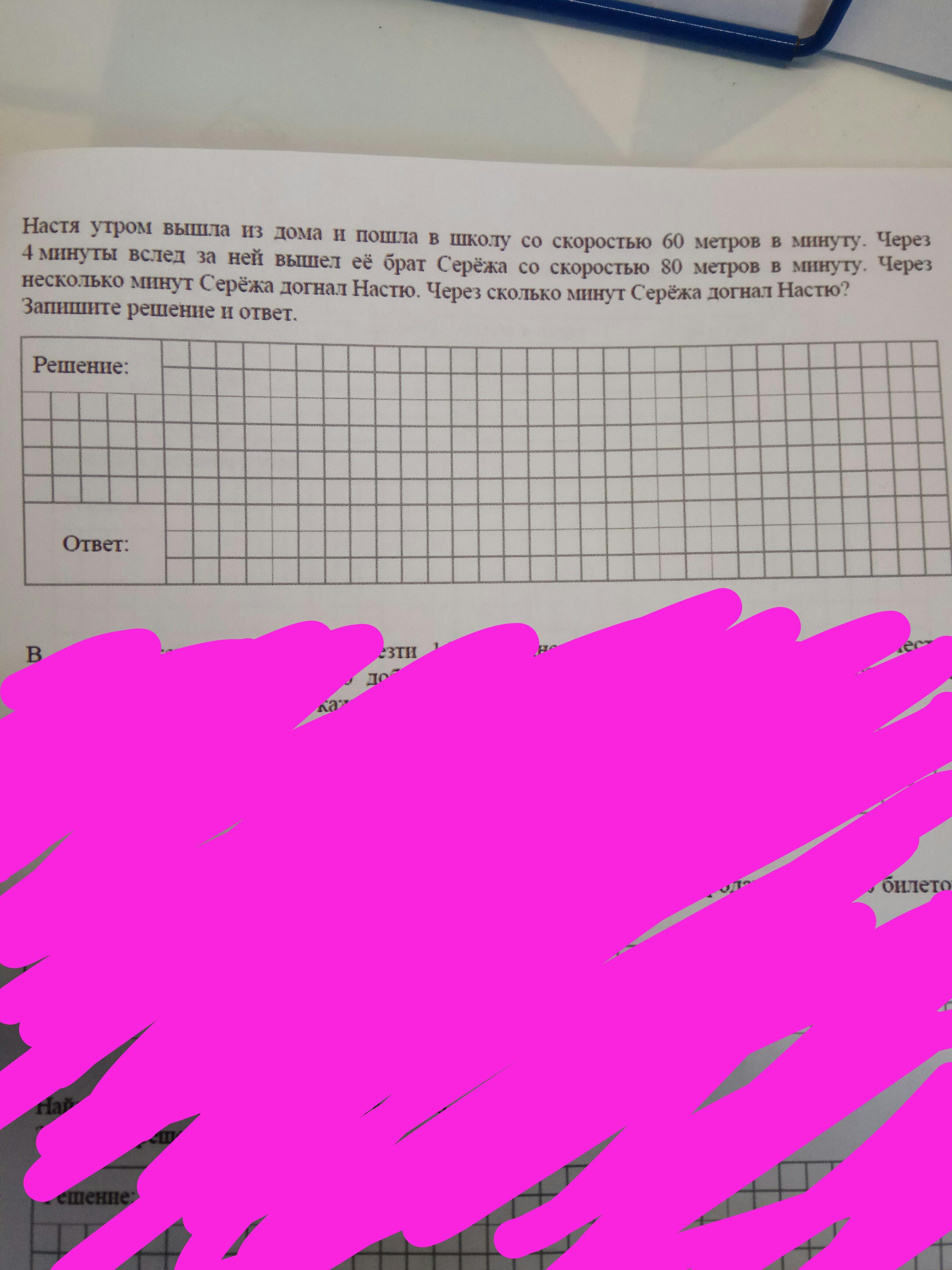 За первые 4 минуты Настя пройдет 240 м. Значит, когда Сережа выйдет, между ними будет расстояние 240 м. Разница скоростей Насти и Сережи 20 метров в минуту, это будет скорость догона. Сережа догонит Настю через 12 минут.