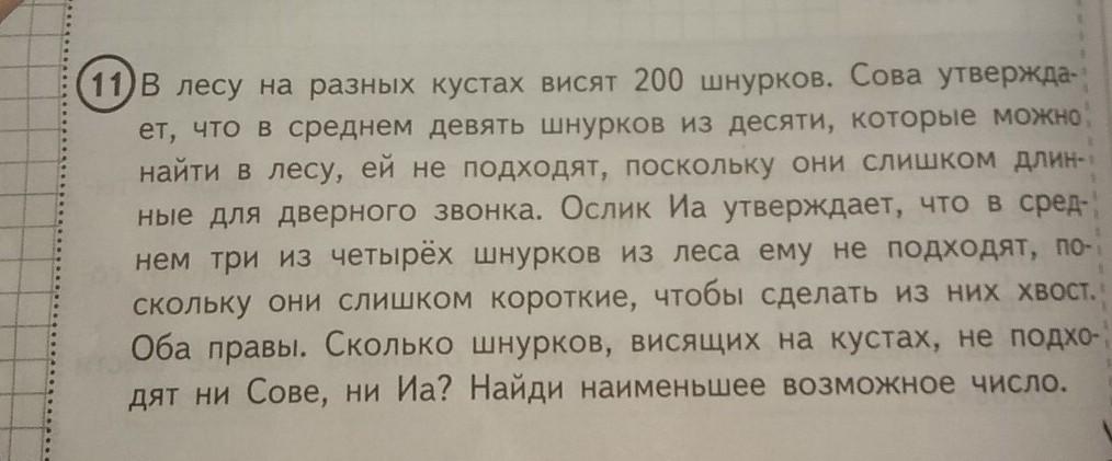 1)200:10*9=180 (шн) )не подходят Сове 2) 200:4*3=150(шн) не подходят Иа. 2)200-180=20(шн) подходит сове. 3) 200-150=50(шн) подходят Иа. 4)180-50=130(шн) не подходят Сове и ИА. 5) 150-20=130(шн) не подходят Сове и Иа. Наименьшее, оно же и единственное - 130 шнурков не подходит Сове и Иа одновременно.