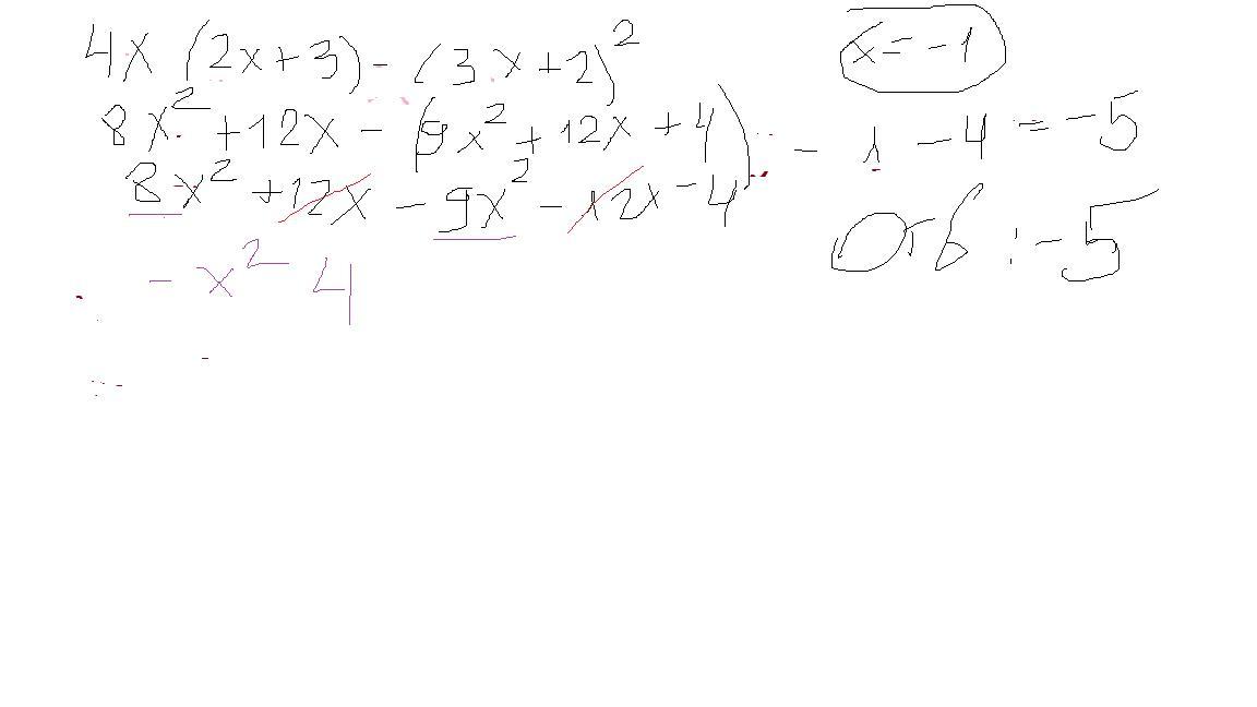 Найдите значение выражения 4х(2х+3)-(3х+2)^2 при х=-1