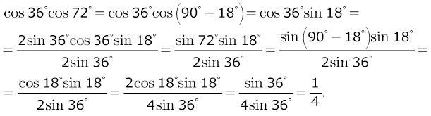 Умножили и поделили на 2sin36° и затем применяется синус двойного угла. Формулы приведения тоже приветствуются.