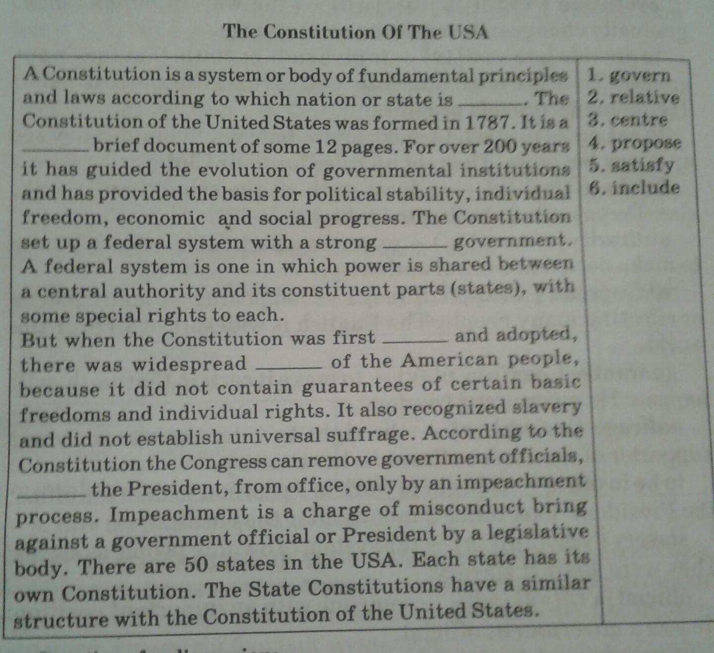 1) Government (Конституция - это система или совокупность основополагающих принципов и законов, в соответствии с которыми управляет нация или государство.)