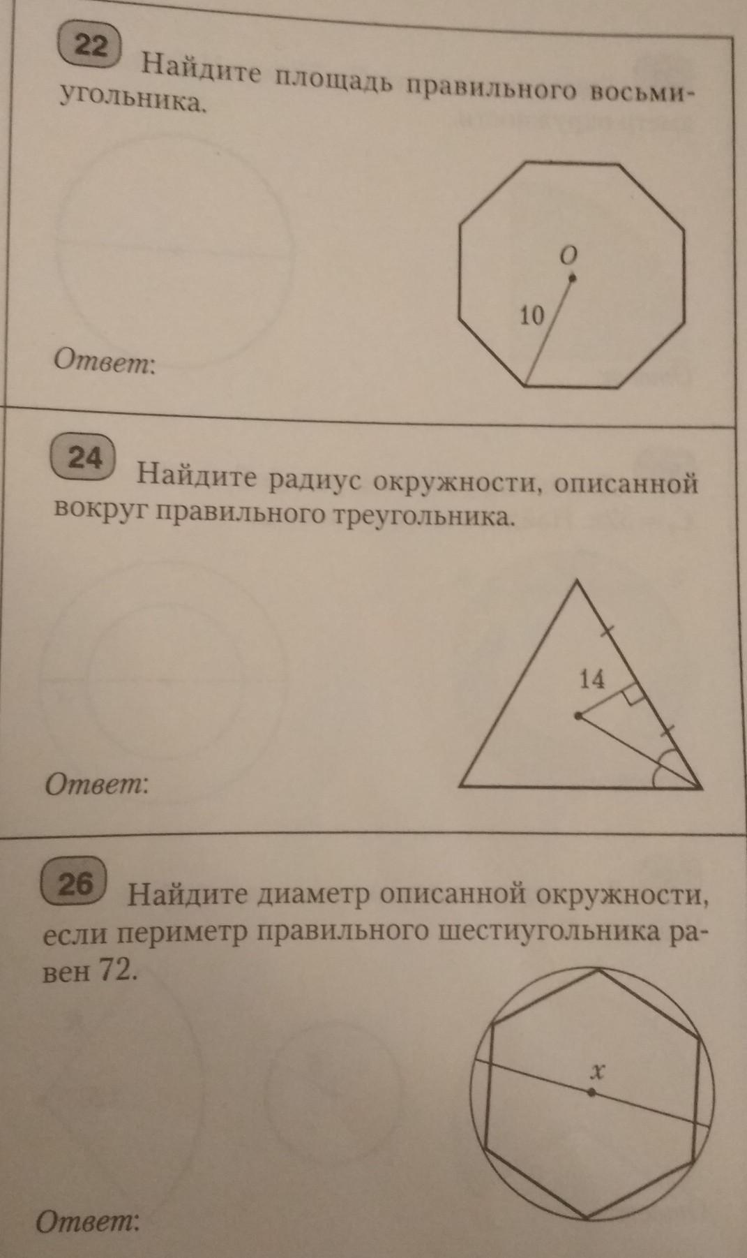 26. Правильный 6-угольник состоит из 6 равносторонних тр-ков, значит сторона а=R, 6a=72 по условию, а=12= R, диаметр D=2R=24