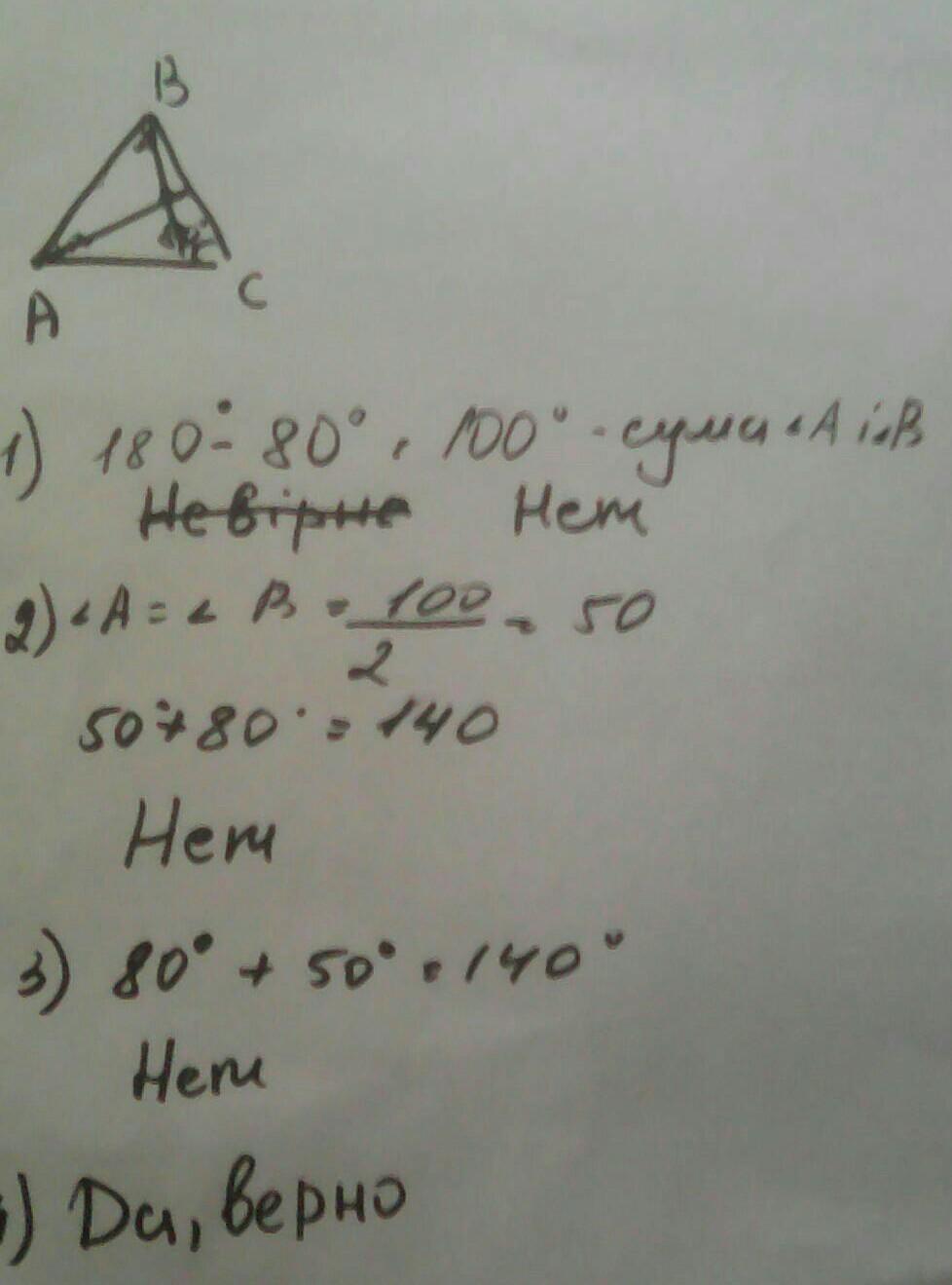 4 )Верно,потому что в образовавшемся треугольнике два угла по 50°,а третий соответственно 80°.(сумма 180°)