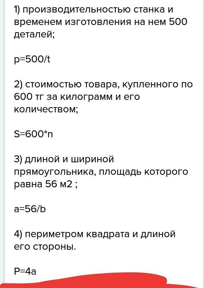 1) производительностью станка c и времени t изготовления 500 деталий 2) стоймость товара a 600 тенге и его количество n 3) периметром квадрата p и стороной a 4) v куба и стороной a вопрос : из 4 форм запишите ту которую имеет вид y= kx запишите k