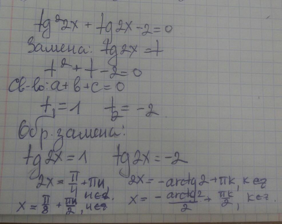 Используя замену и обратную замену, получаем ответы : х= pi/8 + pi*n/2, n принадлежит z(целым числам) ; х= - arctg2/2 + pi*k/2, k принадлежит z(целым числам)