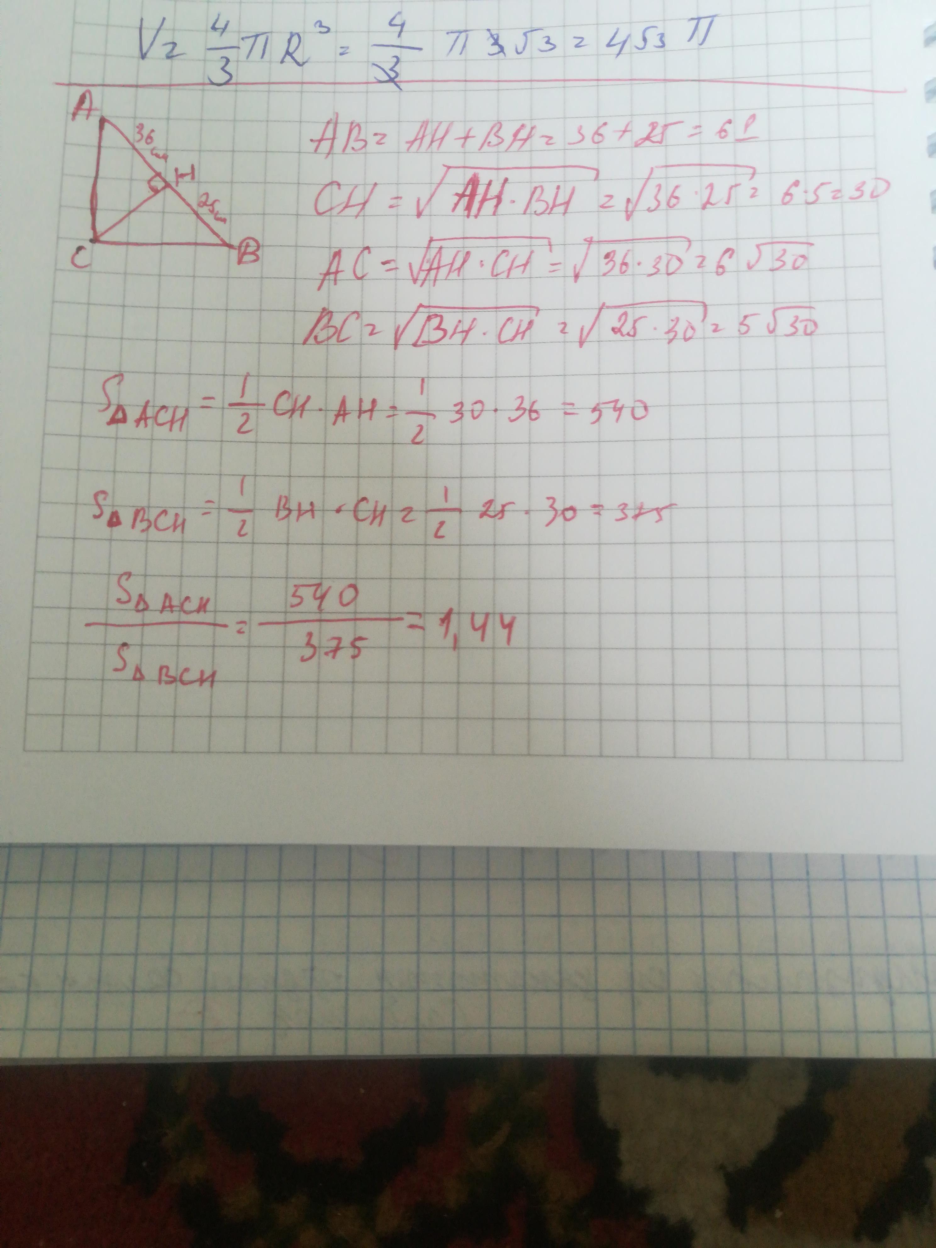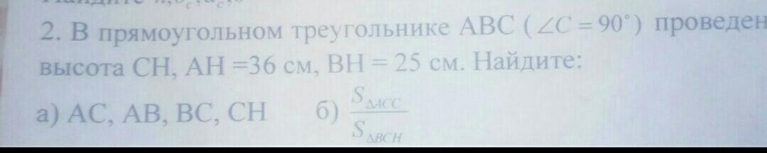 В прямоугольном треугольнике ABC (угол C=90°) проведена высота CH, AH=36 см, BH=25 см. Найдите а) АС, АВ, ВС, СН б) S∆ACC/S∆BCH