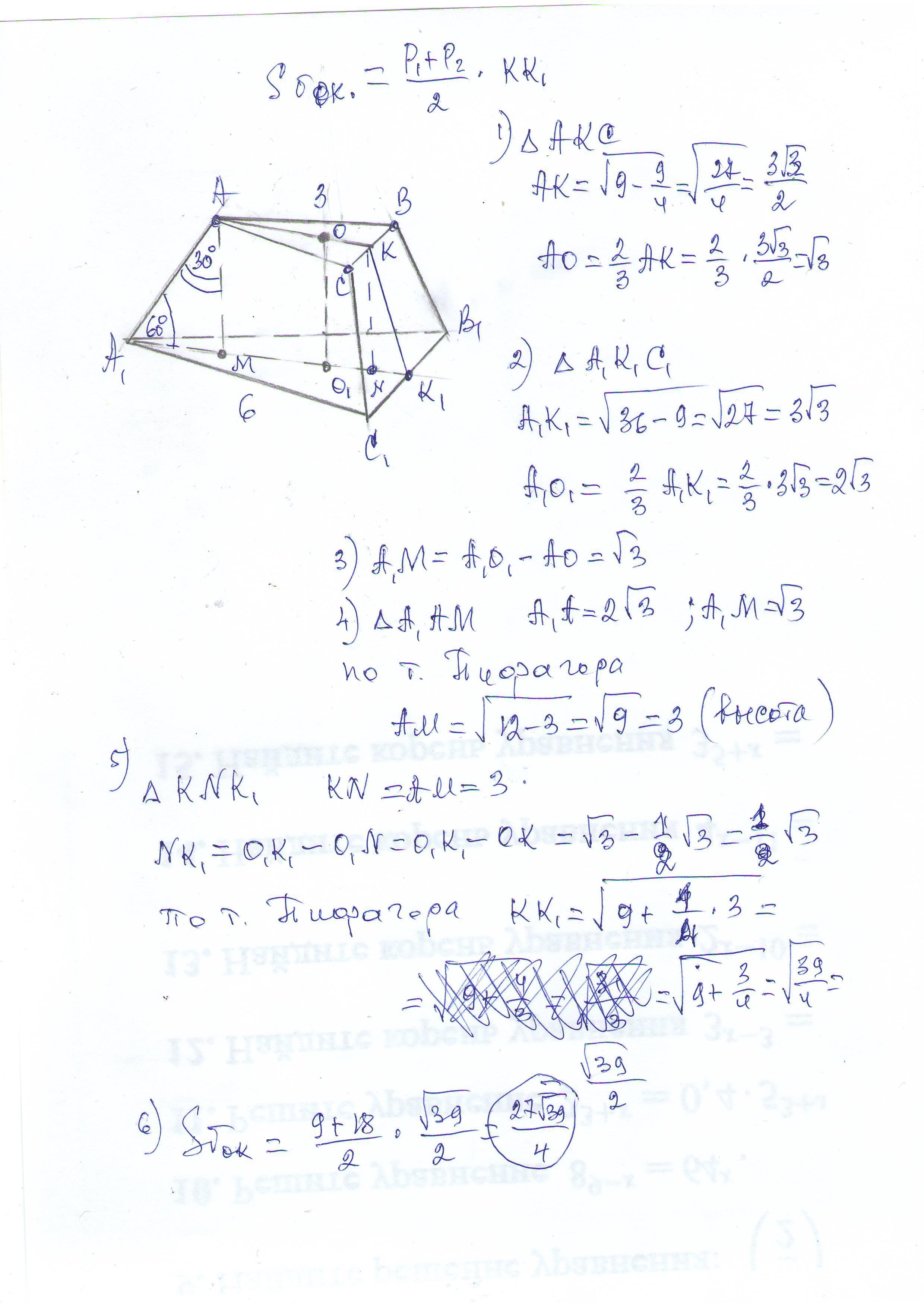 Стороны оснований правильной треугольной усеченной пирамиды равны 3 и 6 найдите площадь боковой поверхности пирамиды если её боковое ребро наклоненно к плоскости основания под углом 60°?