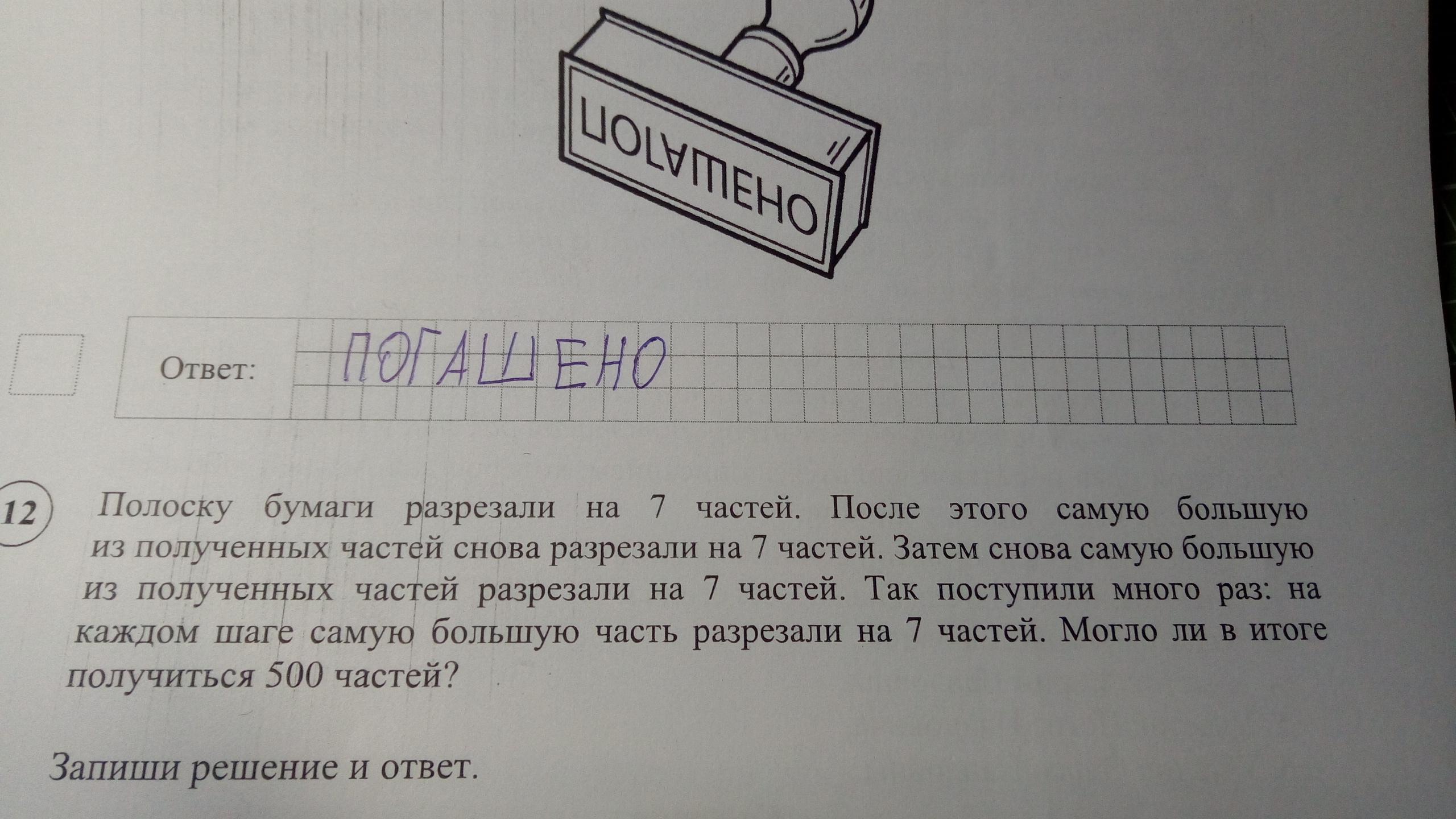 Затем еще одну полоску разрезали на 7 частей, получилось 12+7=19 - снова нечетное число.