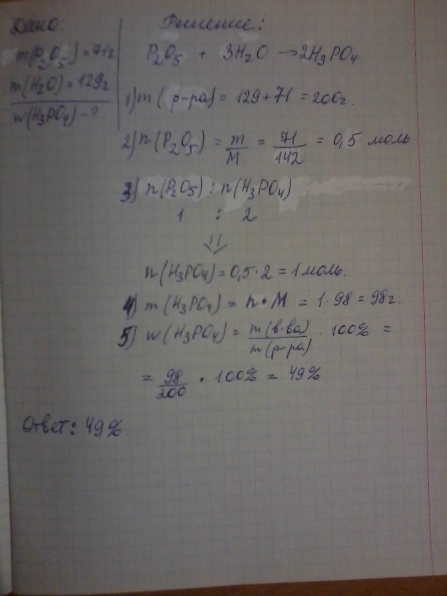 Вычислите массовую долю ( в процентах) ортофосфорной кислоты в растворе, полученном при растворении 71 г оксида фосфора (v) в 129 г воды. ( Пожалуйста с формулами)