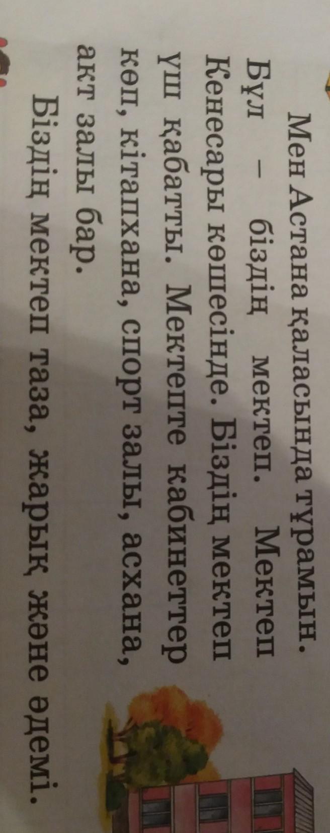 я живу в городе Астане .Это наша школа.Наша школа на улице Кенесарова. Наша школа трехэтажная .Dirjkt есть много кабинетов, библиотека ,спортзал , столовая есть актовый зал.