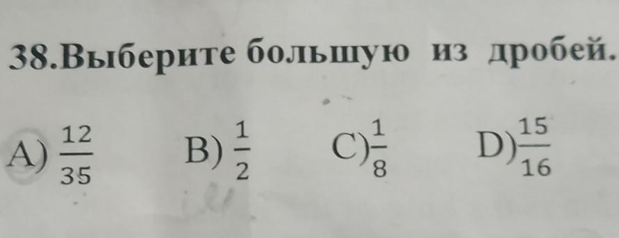 Чем меньше знаменатель, тем больше дробь. Меньший знаменатель у дроби 1/2. Ответ: В