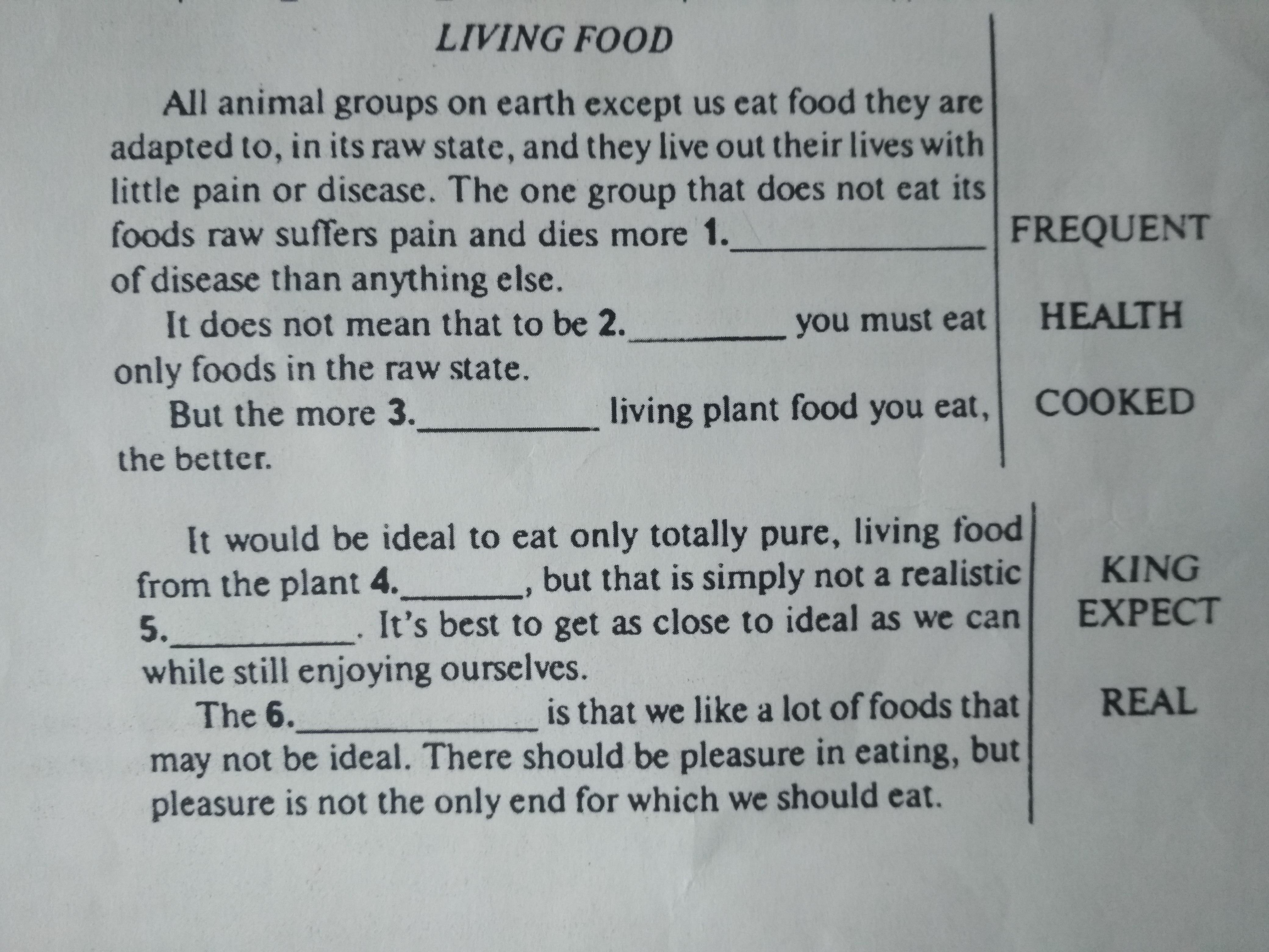 Ответ=1.frequently2.healthier3.uncooked4.kingdoom5.expectance6.reality