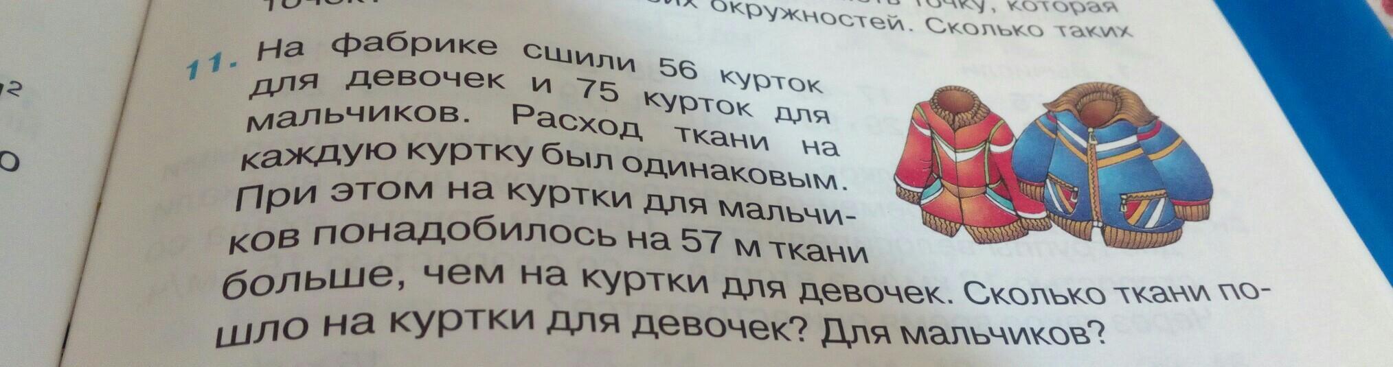 (2) 57 : 19 = 3 ( м ) - ткани расходуется на пошив одной куртки
