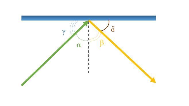 Углом падения называют угол между нормалью к поверхности и падающим лучом. Здесь падающий луч изображён зелёным цветом, нормаль к поверхности – пунктиром, это стороны угла α