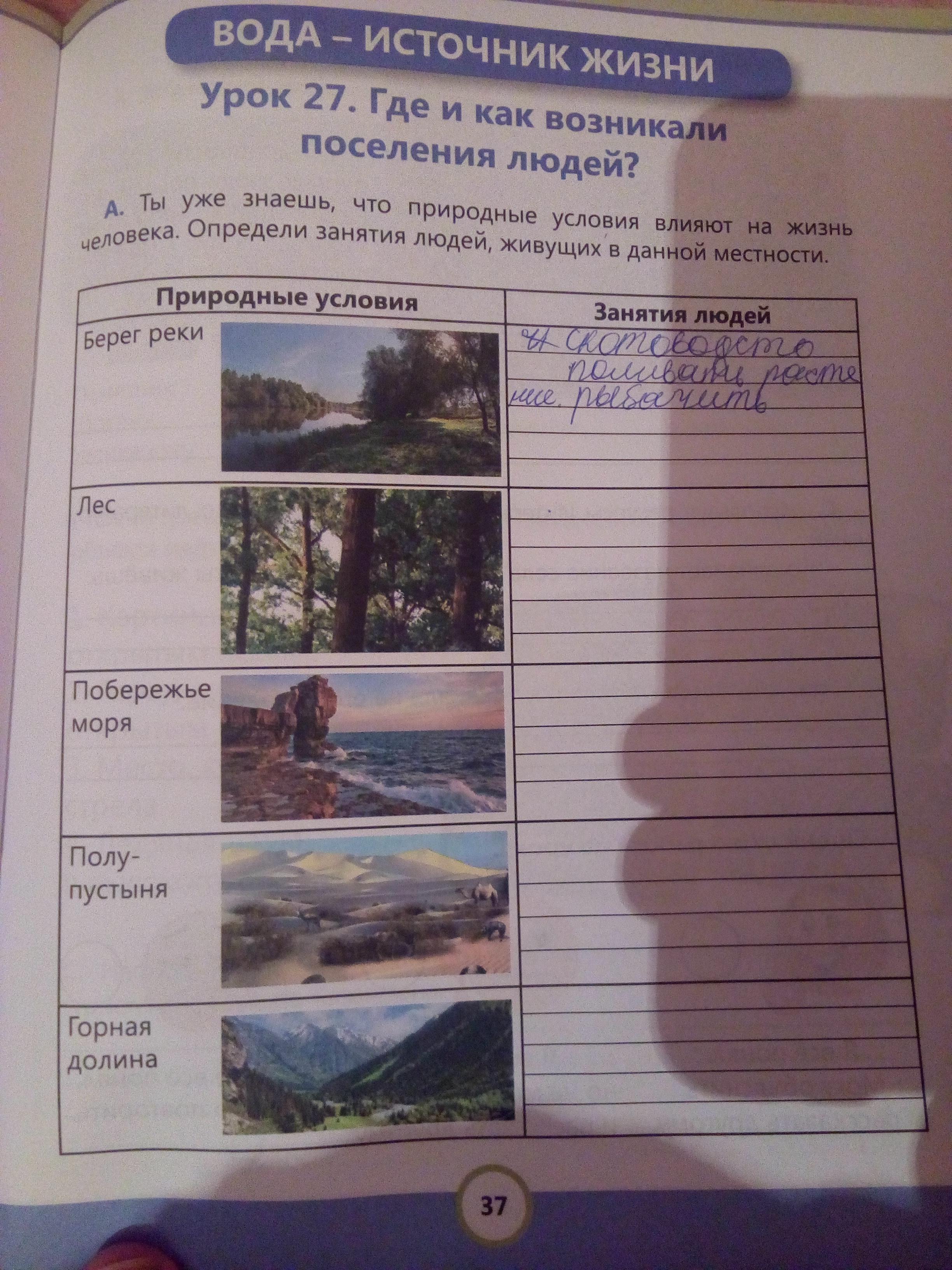 Лес- собирание ягод, грибов и других съедобных плодов, охота. Побережье моря - ловля рыбы, добывание воды для хозяйственных нужд. Полу-пустыня - добыча полезных ископаемых. Горная долина - скотоводство, добыча полезных ископаемых.