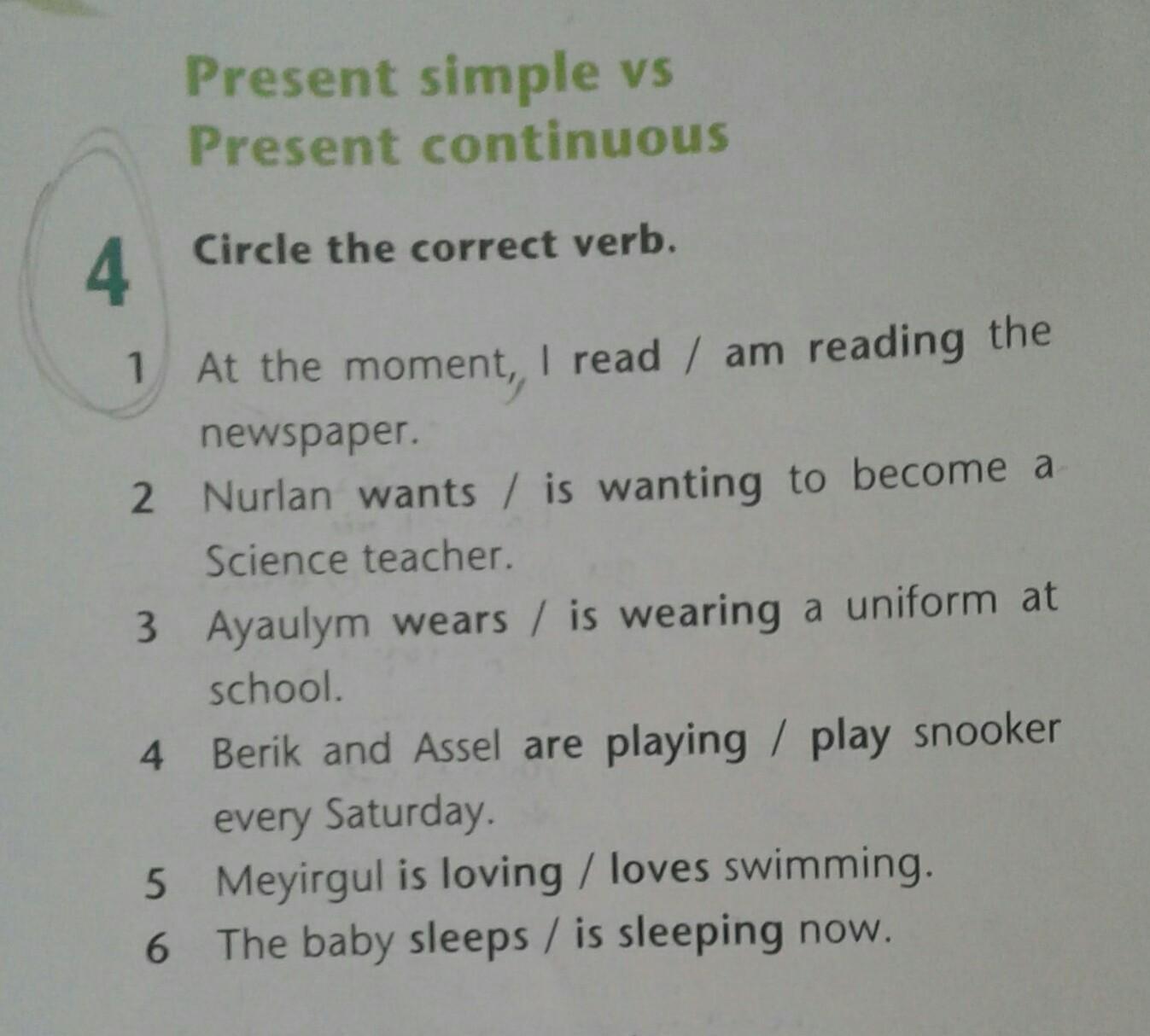 1 am reading 2 wants 3 wears 4 play 5 loves 6 is sleeping